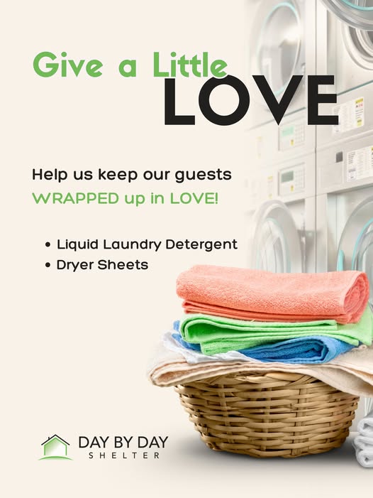 Liquid laundry detergent and dryer sheets help keep Day By Day guests wrapped up in love with fresh bedding and clothing every day! Consider adding these items to your next shopping trip and help the Shelter continue providing this essential service.