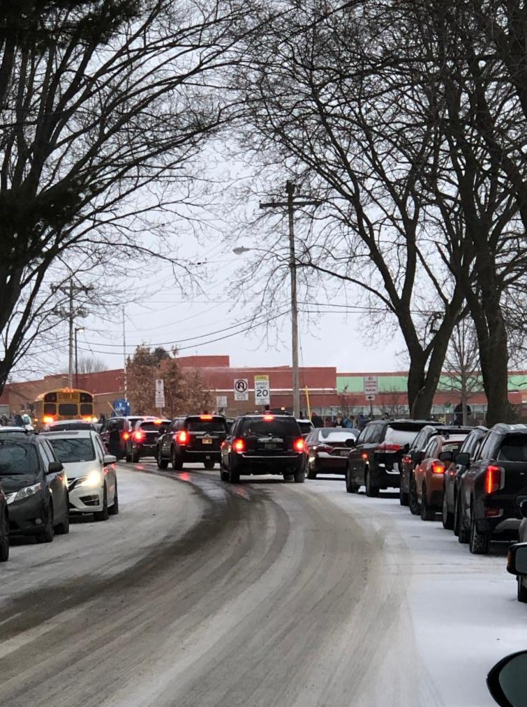 Do you know that well over 1,000 people arrive to our combined Hamilton/Van Hise campus each and every school day? In the morning, the arrival works pretty well as there is a large window of time across which students arrive to campus. The afternoon can be a different story at Hamilton when 740+ students all depart our campus at the same moment. The photo accompanying this news item is from a rainy/snowy day end of day pick up this past spring. These inclement weather days are particularly problematic in that the vehicle traffic is much, much higher, often creating grid-lock on Waukesha Street, which in turn prevents our buses from reaching the pick up area--with the result being lots and lots of students standing in the rain waiting.
