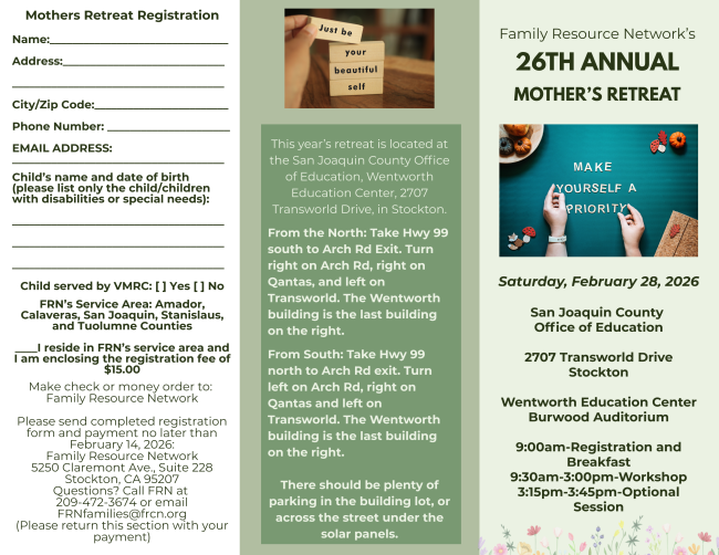 Registration is limited, and your space is reserved upon submission of the registration form and a $15.00 fee. For more information, don't hesitate to get in touch with FRN at 209-472-3674 or FRNfamilies@frcn.org