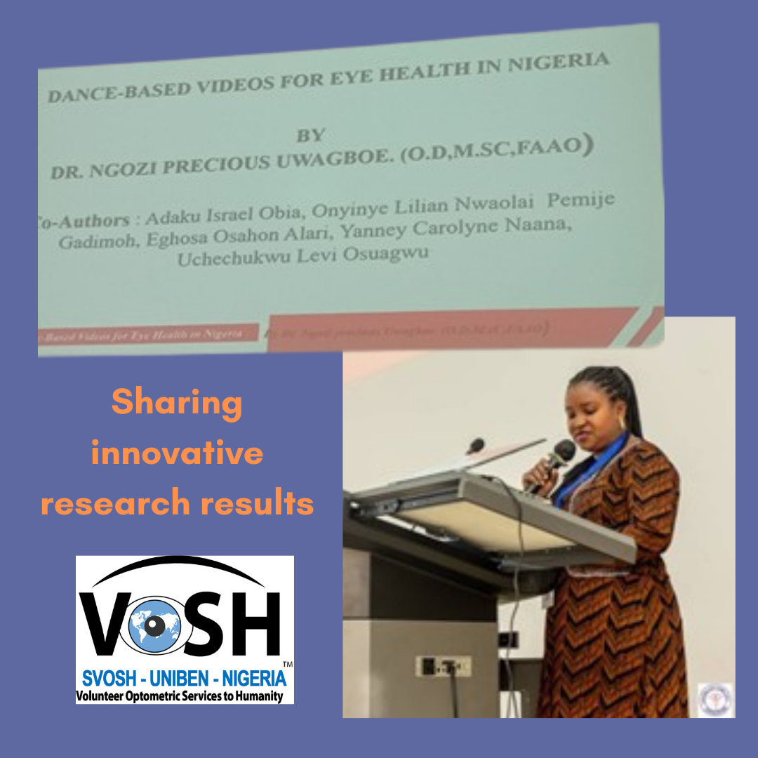 Dr. Ngozi Precious Uwagboe, Faculty Advisor for SVOSH University of Benin (SVOSH-UNIBEN), presented her groundbreaking research, “Dance-Based Videos for Eye Health in Nigeria.” at the recent Ghana Optometric Association Conference. Supported by a small VOSH/International research grant, the study will be published soon.