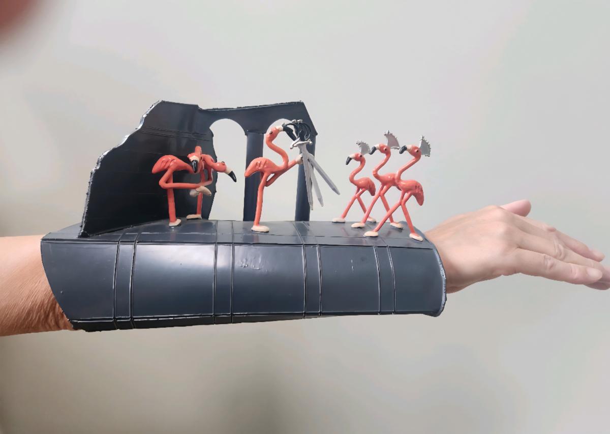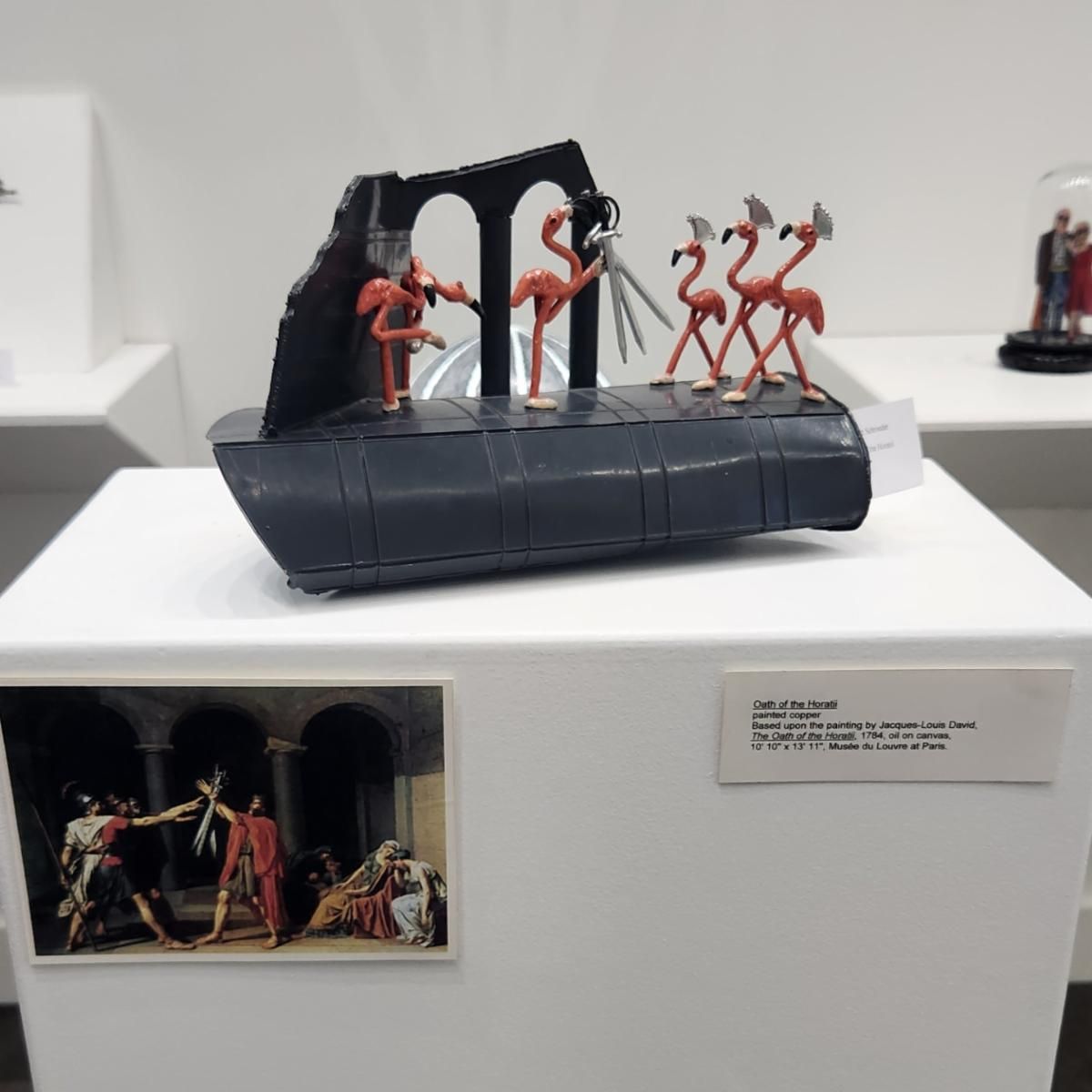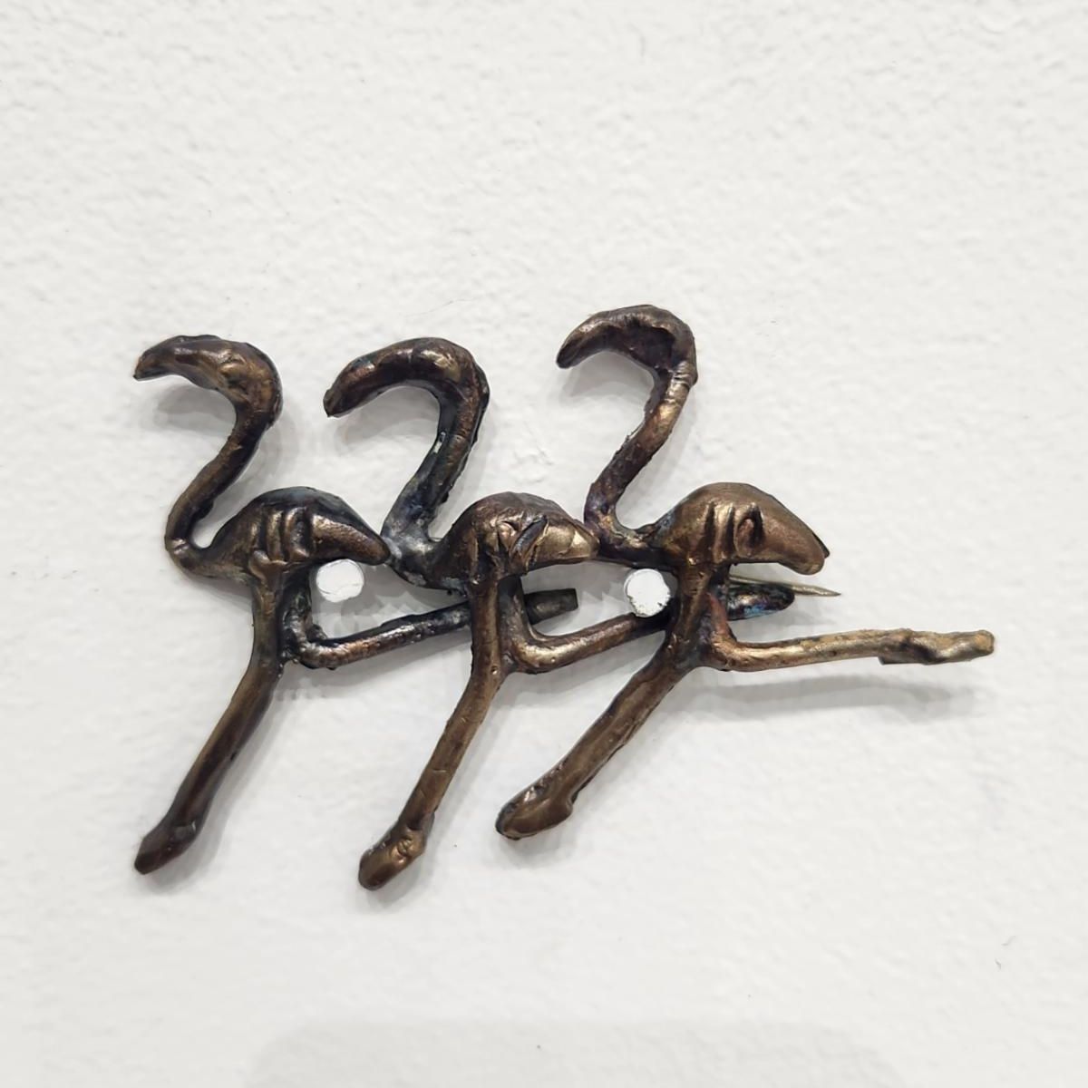| | Several pieces by metalsmithing artist and lecturer Robert Schroeder have been selected for a prestigious jewelry show at the Bernice Steinbaum Gallery in Miami, Florida. The exhibition celebrates jewelry by artists who are not jewelers by trade or tradition. Cast in bronze or sterling silver, his fabulous flamingo brooches are lightweight and wearable due to their hollow design. The gauntlet featured is part of a series of irreverent bracelets satirizing well-known, historic paintings. This one is based on “The Oath of the Horati” and is fashioned from painted, electroformed copper. | | |