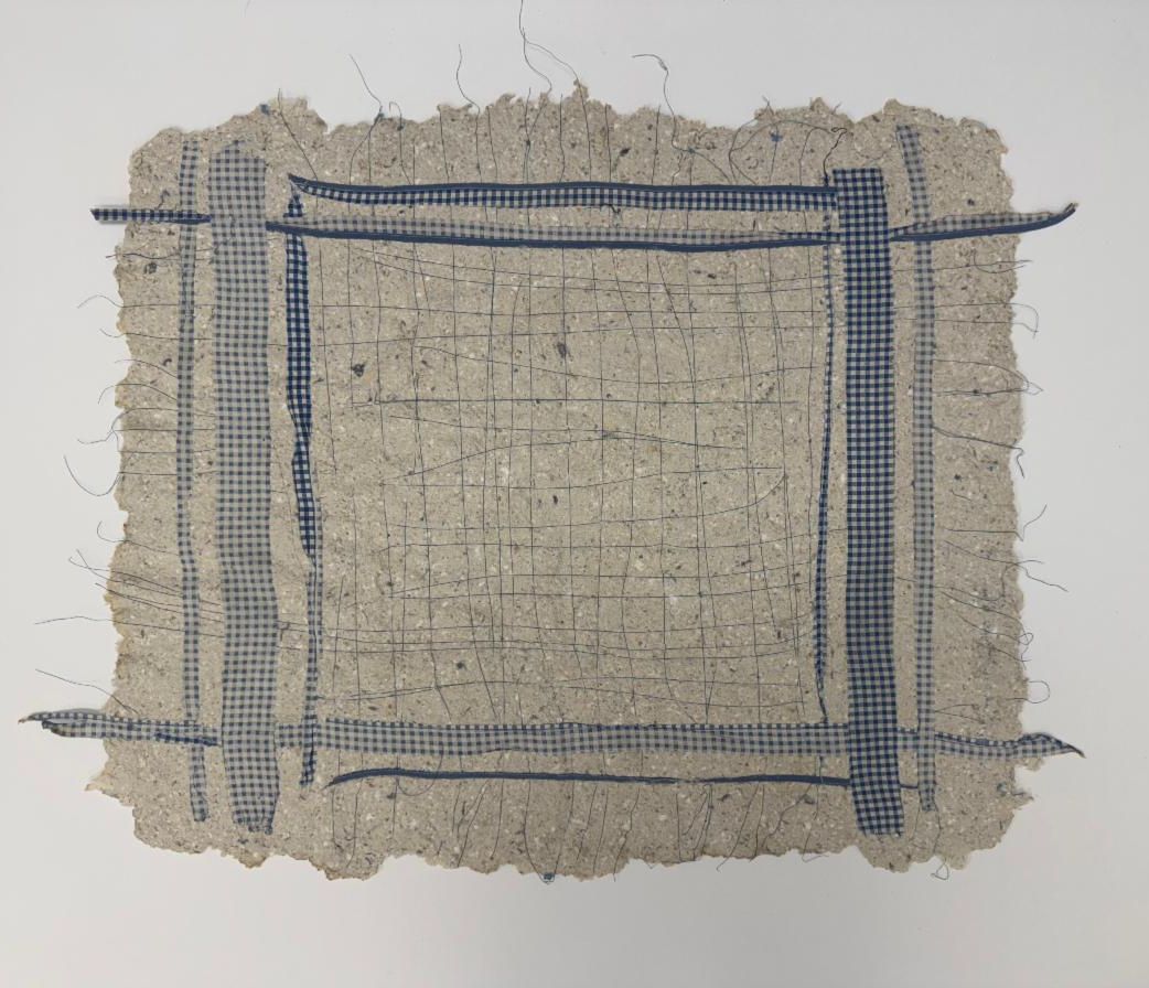 Handmade paper made from pulp with found paper, virgin cotton, and dryer lint, with torn apron ties and quilting thread inclusions