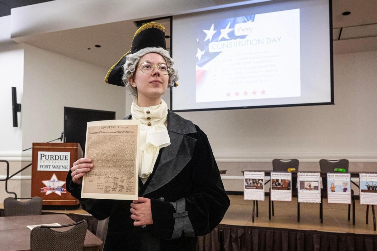 | | Dressed for the occasion, senior music therapy student Emma Keeling was among the participants at Purdue Fort Wayne's 2025 Constitution Day observance, a national event marking the original document's ratification. Other activities in the Classic Ballroom at Walb Student Union included a choir performance, a reading of the Constitution, a trivia contest, a panel of political science faculty, and a costume contest. | | |