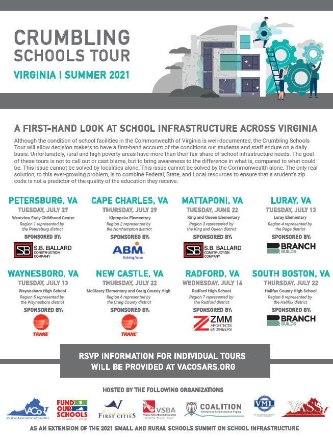 VSBA is proud to be one of the cohosts for the 2021 Summer Crumbling Schools Tour. The tour dates and locations have begun to be announced and will continue to be updated with times and additional details. The tour information as available is listed below. For more information, or if you have any questions, please reach out to J.T. Kessler at jason@vsba.org.