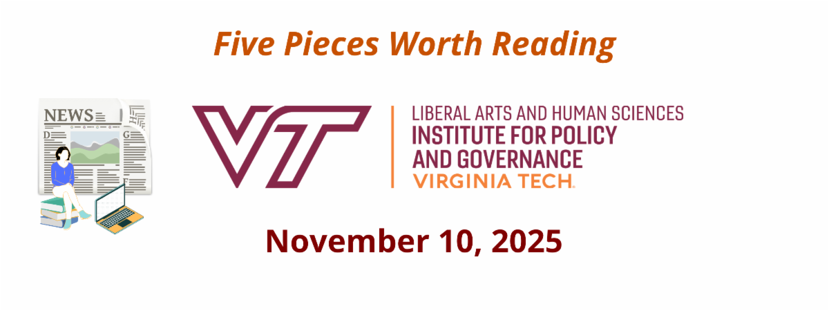 We share five articles each week that we find timely and meaningful that address concerns related to the state of our democracy and civil society. We aim to offer pieces that illuminate significant dimensions of our country's policy and governance challenges and the state of social norms that sustain the possibility of addressing those concerns. Please note, the views expressed in these essays do not necessarily reflect the perspectives of VTIPG faculty or staff or of Virginia Tech. We upload these articles and stories to our website. You may find that archive at News and Opportunities at http://ipg.vt.edu.