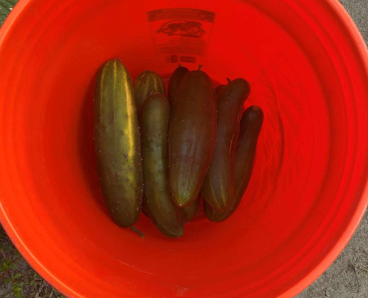 Each volunteer gets a bucket to fill with cucumbers