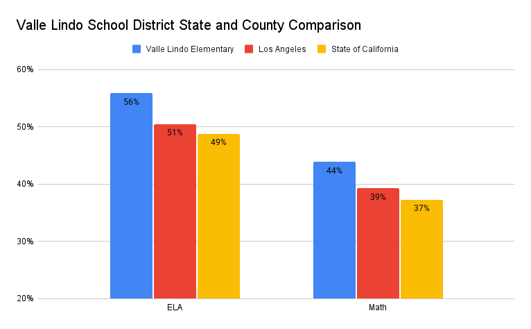According to the 2024–25 California Assessment of Student Performance and Progress (CAASPP) results, 56% of Valle Lindo students met or exceeded standards in English Language Arts, compared to 50.5% countywide and 48.8% statewide. In Mathematics, 44% of students met or exceeded standards, outperforming Los Angeles County (39%) and the State of California (37%).