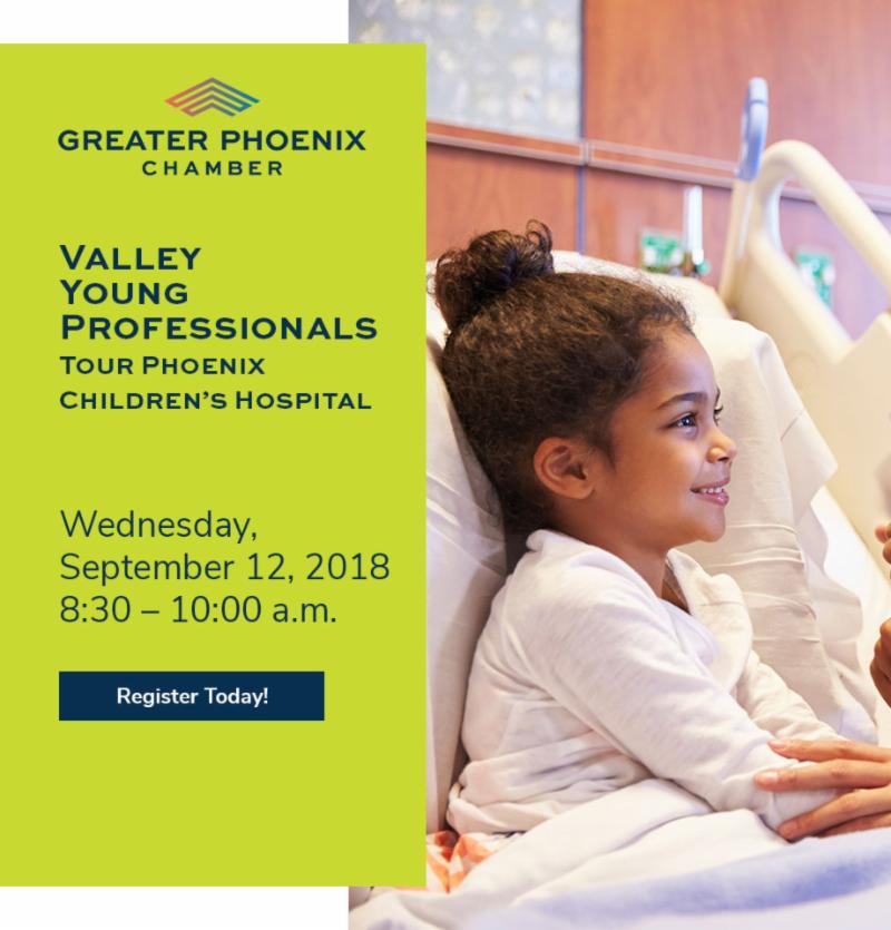 oin the Valley Young Professionals for a behind-the-scenes tour of Phoenix Children's Hospital! Phoenix Children's Hospital is one of the largest and most respected children's hospitals in the nation and provides care for the most critically ill and injured children when they need it most. The hospital treated over 148,000 patients last year, and within five years, 1 in 4 Arizona children will have received care from a Phoenix Children's provider.