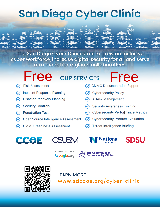 | | | | Free Cyber Security Clinic | CSUSM has partnered with CCOE, SDSU and National University to offer a Cyber Clinic and offers 14 different free services including Risk Assessment, Incident Response Planning, Cybersecurity Policy, Security Controls and more. Learn more about this free resource here. | | | | Energy Bill Assistance Programs: Help is Available | Whether you rent or own, you could be eligible to receive no-cost, energy-efficient home improvements that can make your home more comfortable and help reduce your energy bill. Find out if you qualify at sdge.com/ESA. | | Want your event to be featured? Submit them on our website here. | | | | 6th Annual VetFest & Veterans Day Parade | |