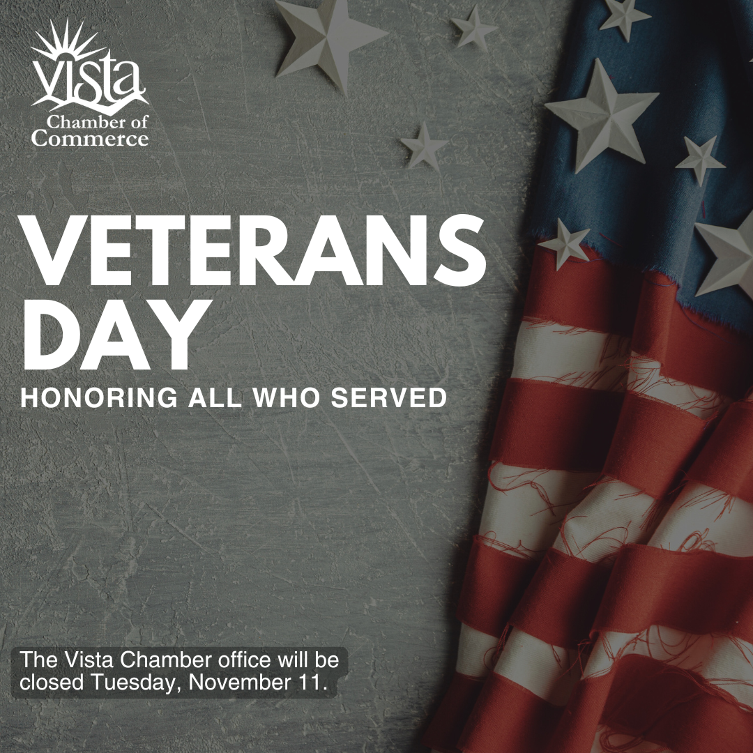 | | Veterans Day - Office Closed | The Vista Chamber office will be closed on Tuesday, November 11 for Veterans Day. We'll remain open on Monday, November 10 and come back to the office on Wednesday, November 12. | | | | | We Want to Hear From You! | |