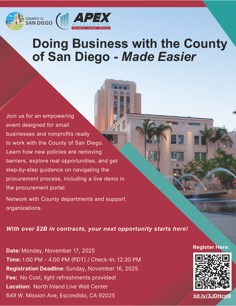 The County of San Diego invites small businesses and nonprofits to attend “Doing Business with the County – Made Easier,” a free event designed to help organizations learn how to successfully navigate the County’s contracting and procurement process.