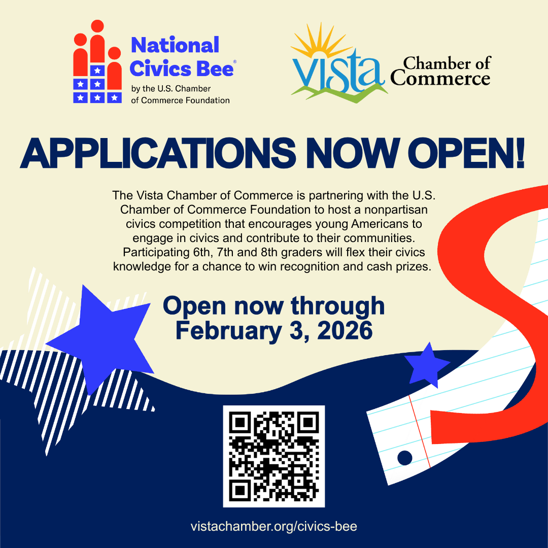 | | Welcome New Vista Chamber Members! | | | Contact Development Director Gumaro Escarcega at gumaro@vistachamber.org to learn more about membership at the Vista Chamber or visit our website here. | | | | Civics Bee Regional Vista Competition | |