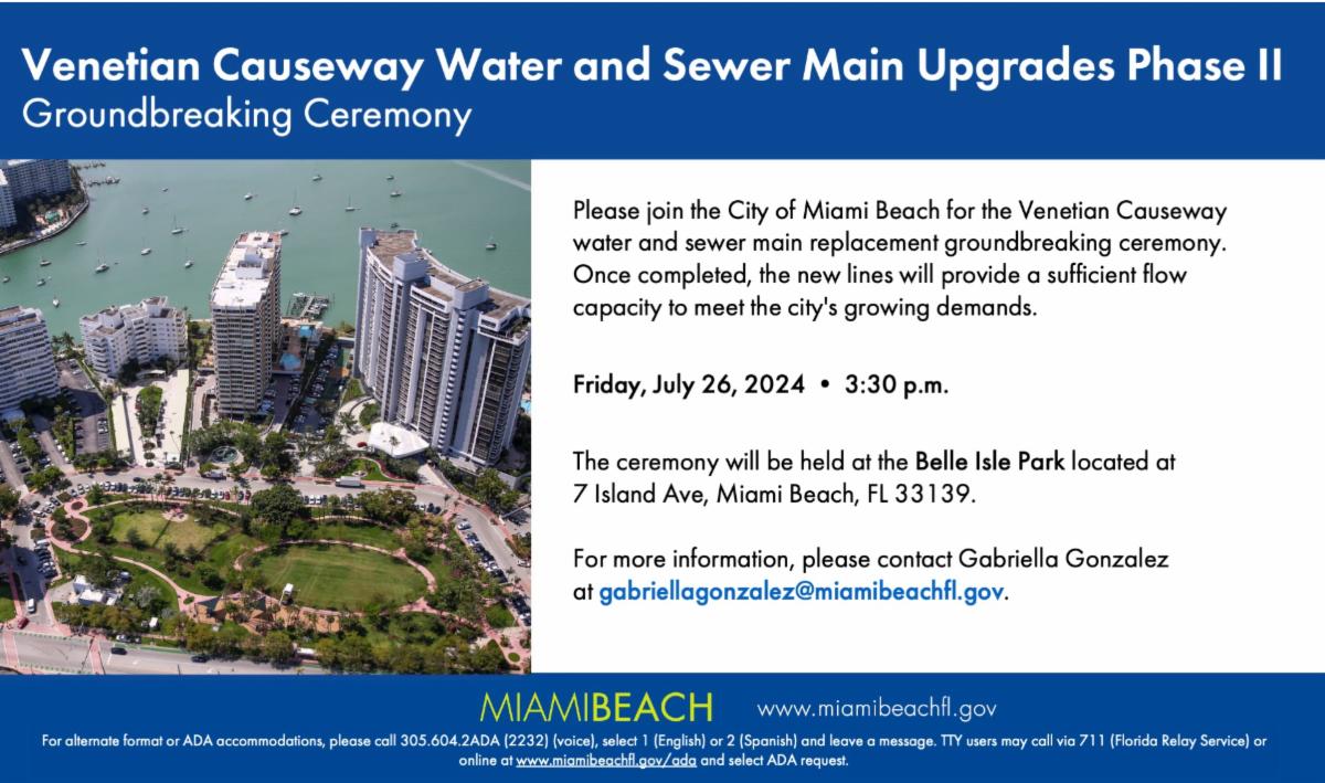 Please join the City of Miami Beach for the Venetian Causeway water and sewer main replacement groundbreaking ceremony. Once completed, the new lines will provide a sufficient flow capacity to meet the city's growing demands.