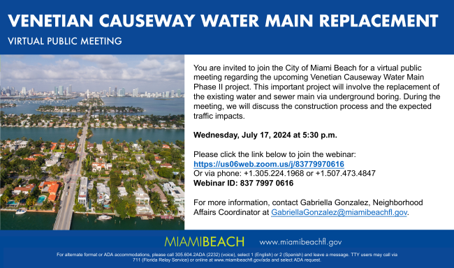 You are invited to join the City of Miami Beach for a virtual public meeting regarding the upcoming Venetian Causeway Water Main Phase II project. This important project will involve the replacement of the existing water and sewer main via underground boring. During the meeting, we will discuss the construction process and the expected traffic impacts.