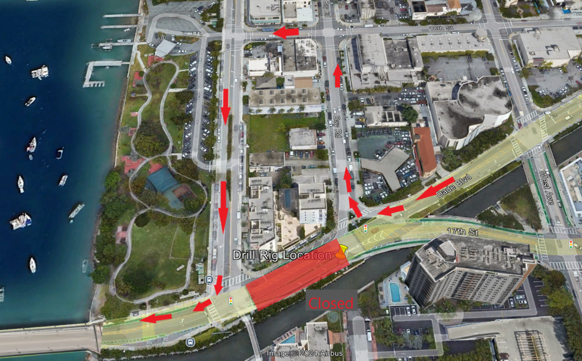 To complete this operation, the contractor must close westbound Dade Blvd between Bay Road and Purdy Avenue. Vehicle, bicycle, and pedestrian traffic will be routed through the Sunset Harbour neighborhood until the repairs are completed, after which the lanes will reopen.