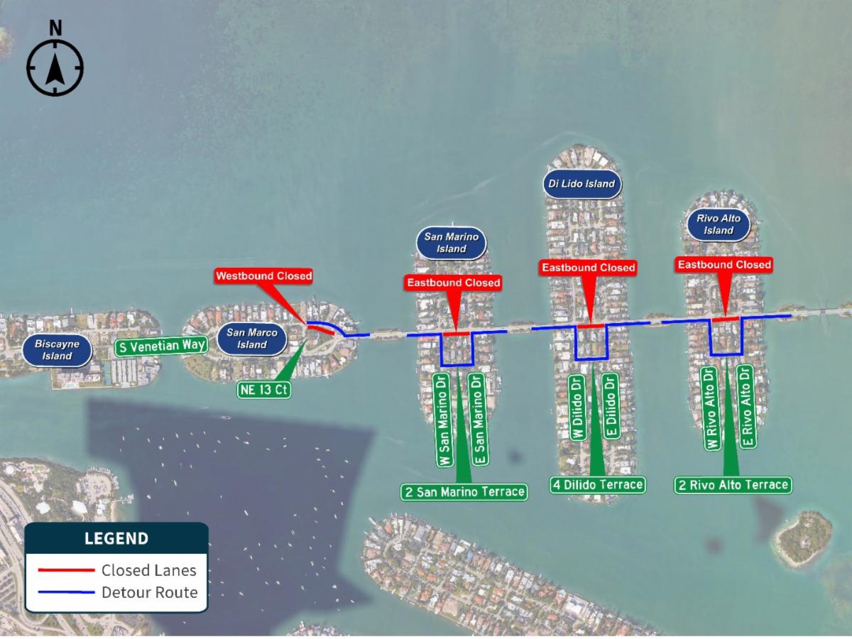 Eastbound traffic, including vehicles and micromobility devices, will be prohibited during the eastbound closure along Venetian Way/Venetian Causeway On San Marino Island and Di Lido Island. Micromobility users and vehicles will share the detour route. Please follow all posted signs for your safety and guidance.