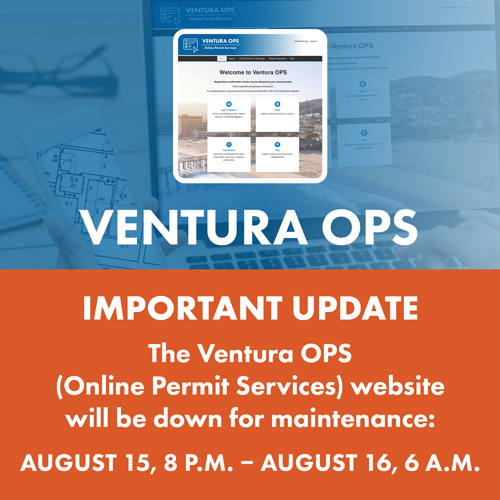 We wanted to notify you that the Ventura OPS (Online Permit Services) website will be down for maintenance starting at 8:00 p.m. on August 15 until 6:00 a.m. on August 16. Please plan accordingly for any permit submittals.