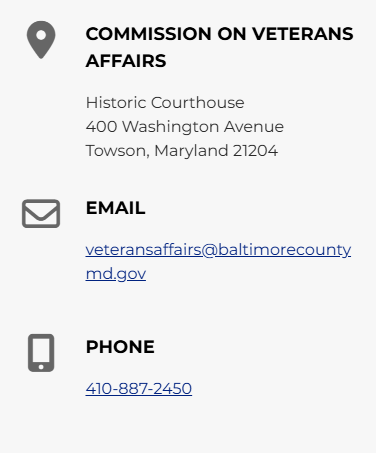 Commission on Veterans Affairs | Baltimore County Government hosts monthly meetings virtually, usually on the first Wednesday of the month.