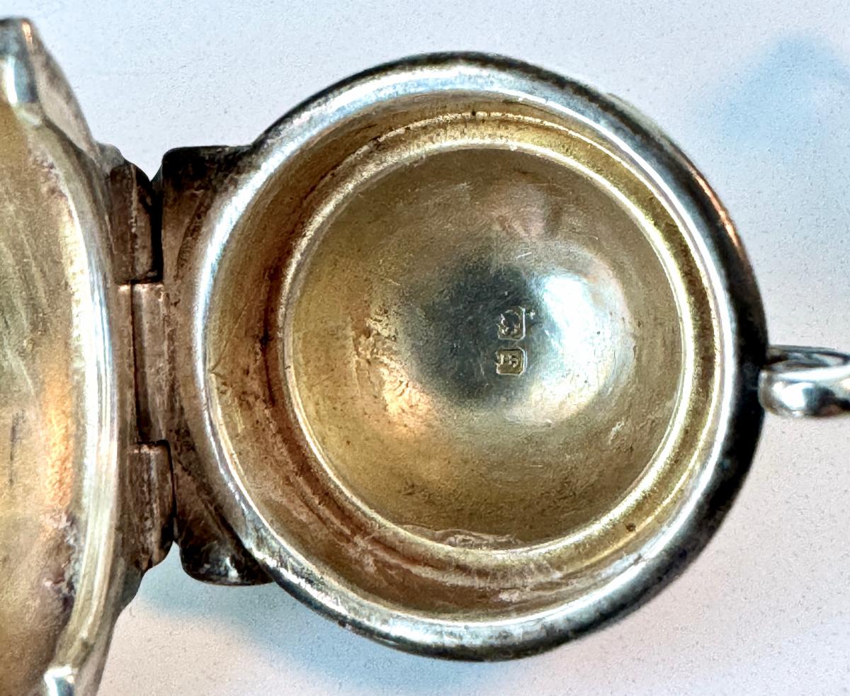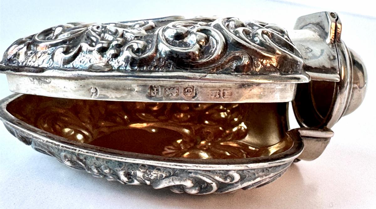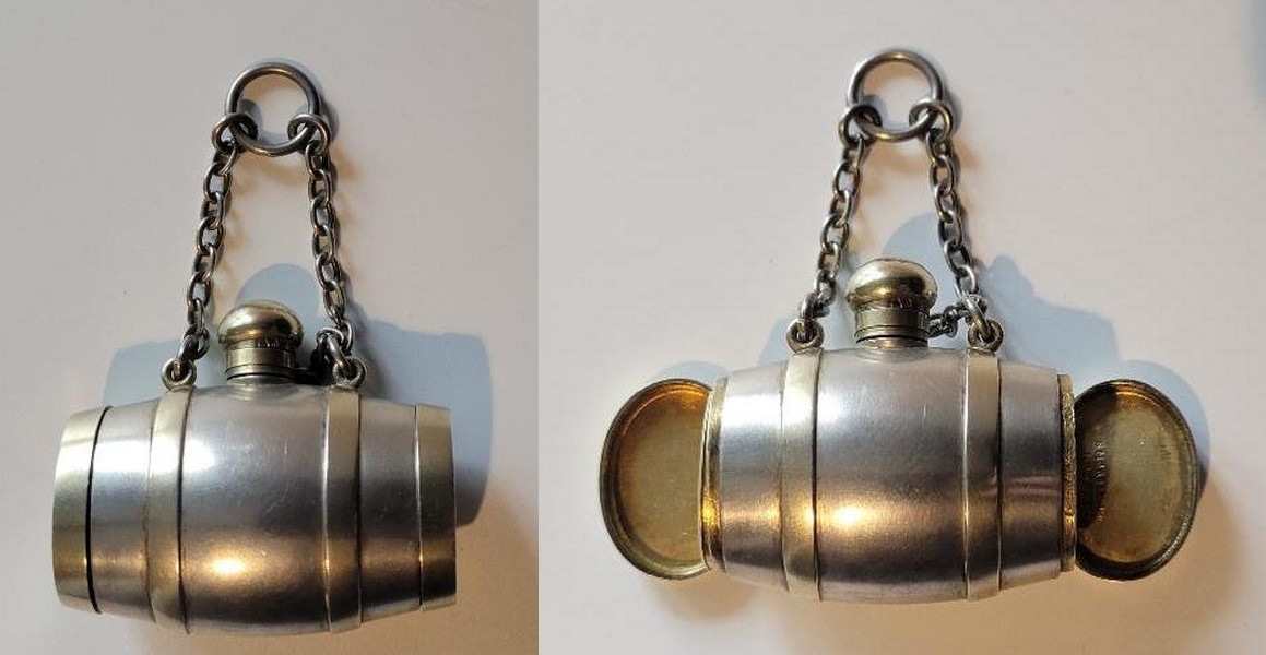 The 2" barrel-shaped vinaigrette opens at both ends. It includes the English hallmarks for 1869 and for the well-known Sampson Mordan company. | |