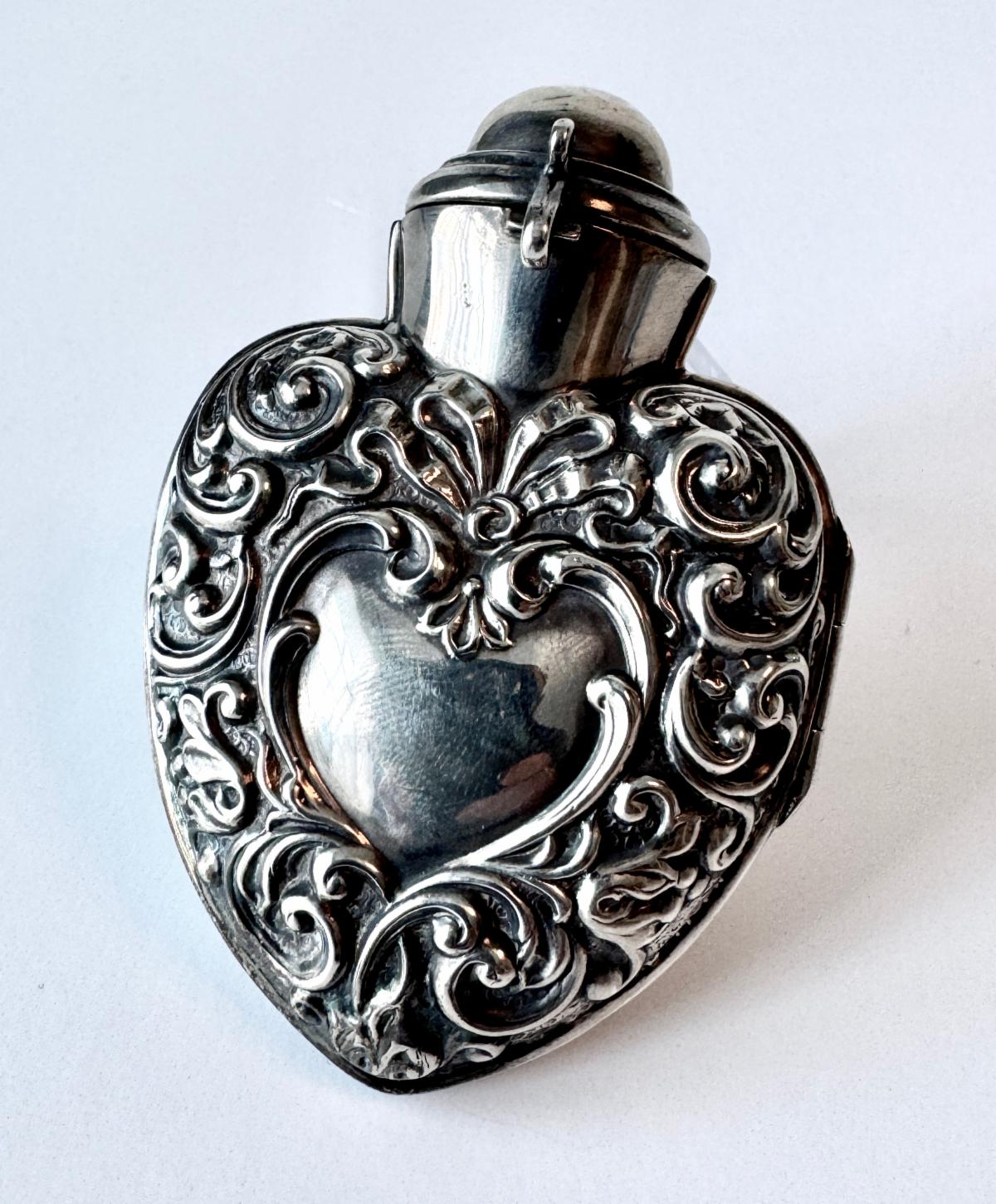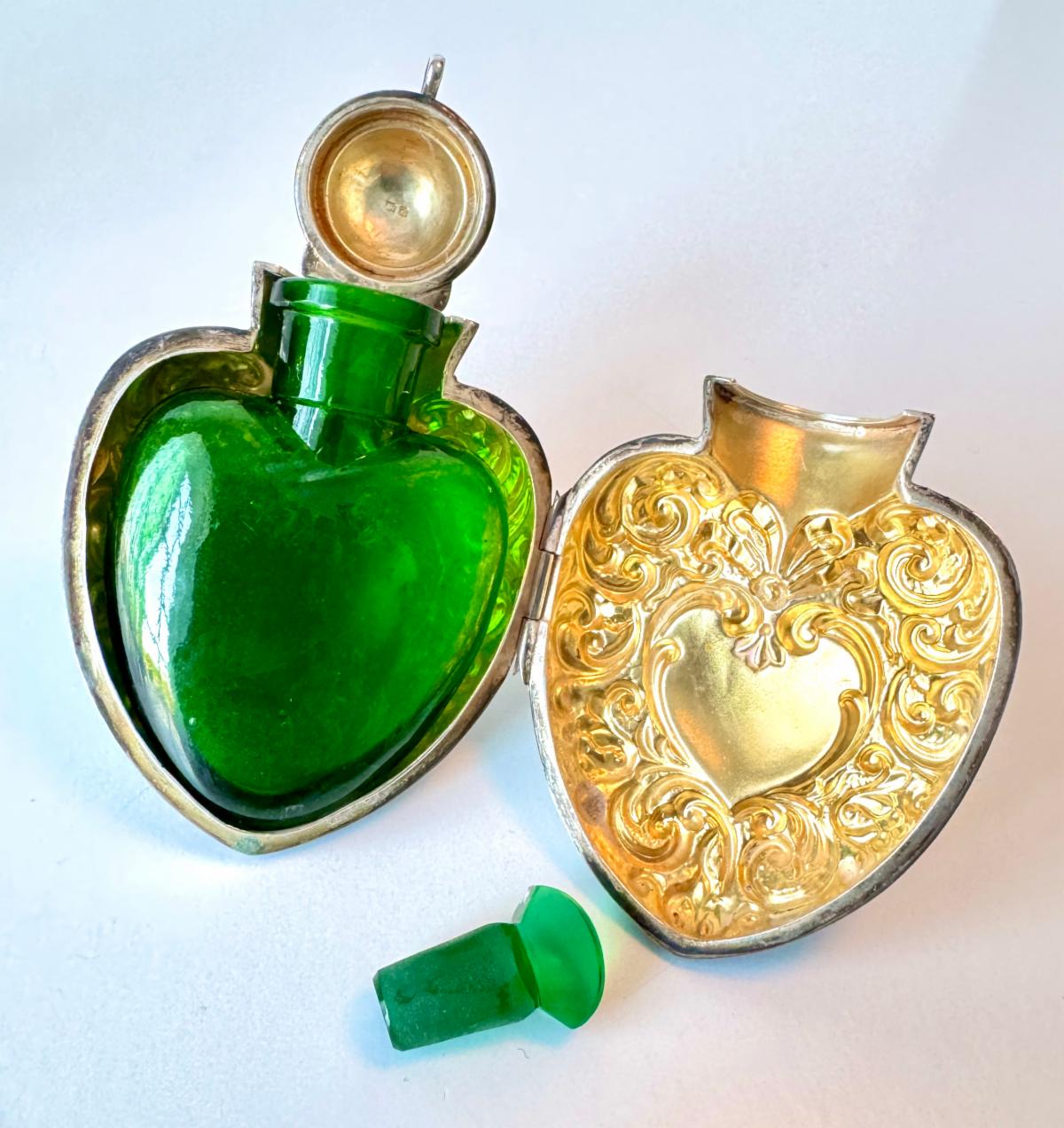 A beautiful sterling heart-shaped perfume holder (below) measures 3-1/2" x 2-1/2" and includes a detailed scroll design on both sides. It has a lift-up cap and a side hinge that opens to reveal the original green glass perfume bottle! It includes the hallmarks for the Birmingham assay office, lion (sterling) and letter dating it to 1905.