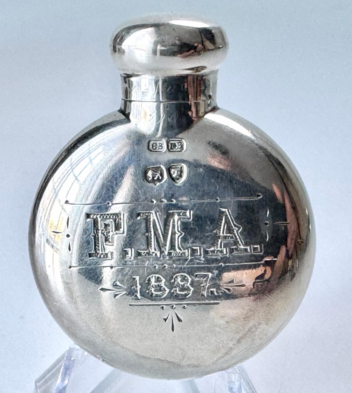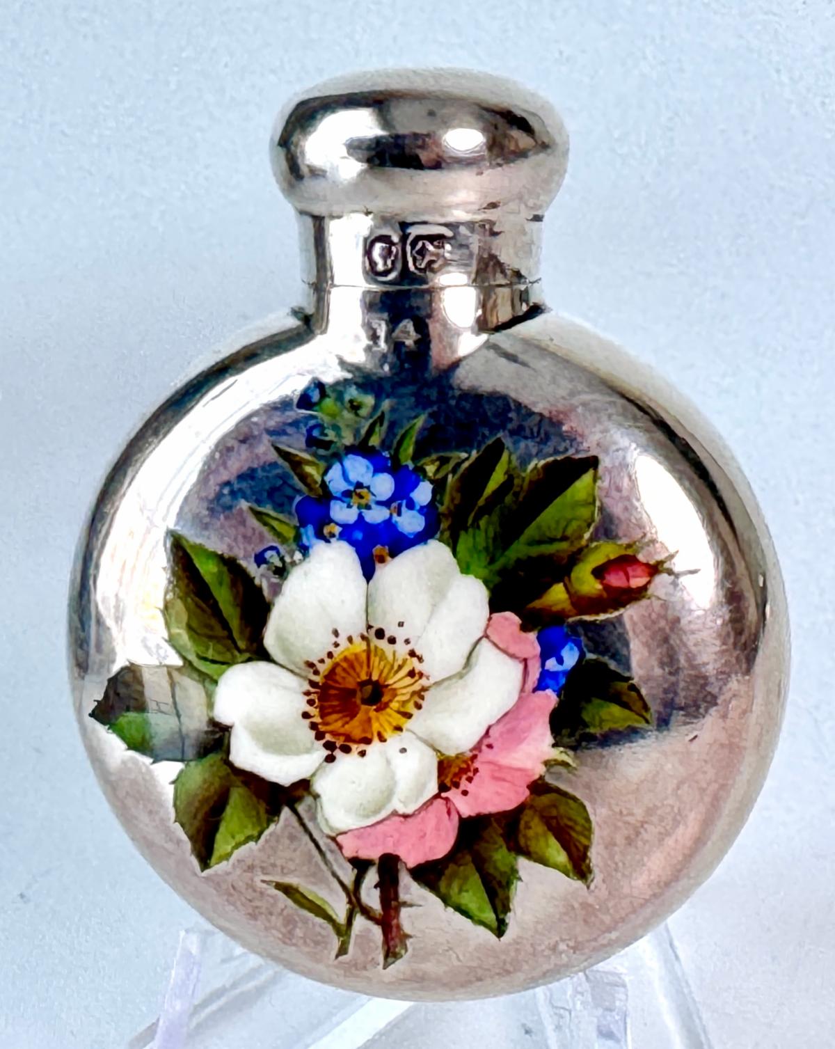 This 2-1/4" x 1-3/4" sterling perfume has a screw-off cap and beautiful enamel flowers on one side. It includes the hallmarks for the London assay office, lion (sterling) and date for 1887. It also has the monogram F.M.A.