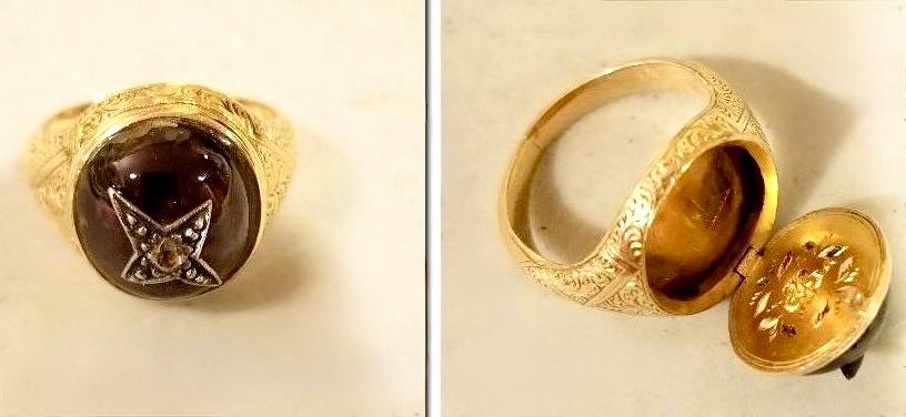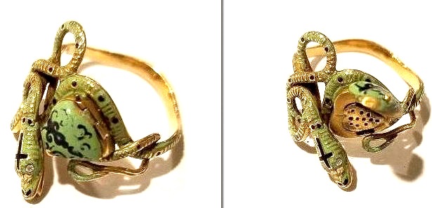 Both of these gold Victorian rings date from the mid to late 1800s and open to reveal a vinaigrette area. During the Victorian era, snakes symbolized eternal love, wisdom, rebirth and healing. Definitely appropriate motifs for a fragrance! The garnet cabochon ring includes rose-cut diamonds and opens to reveal an area for a perfumed-soaked cloth. | |