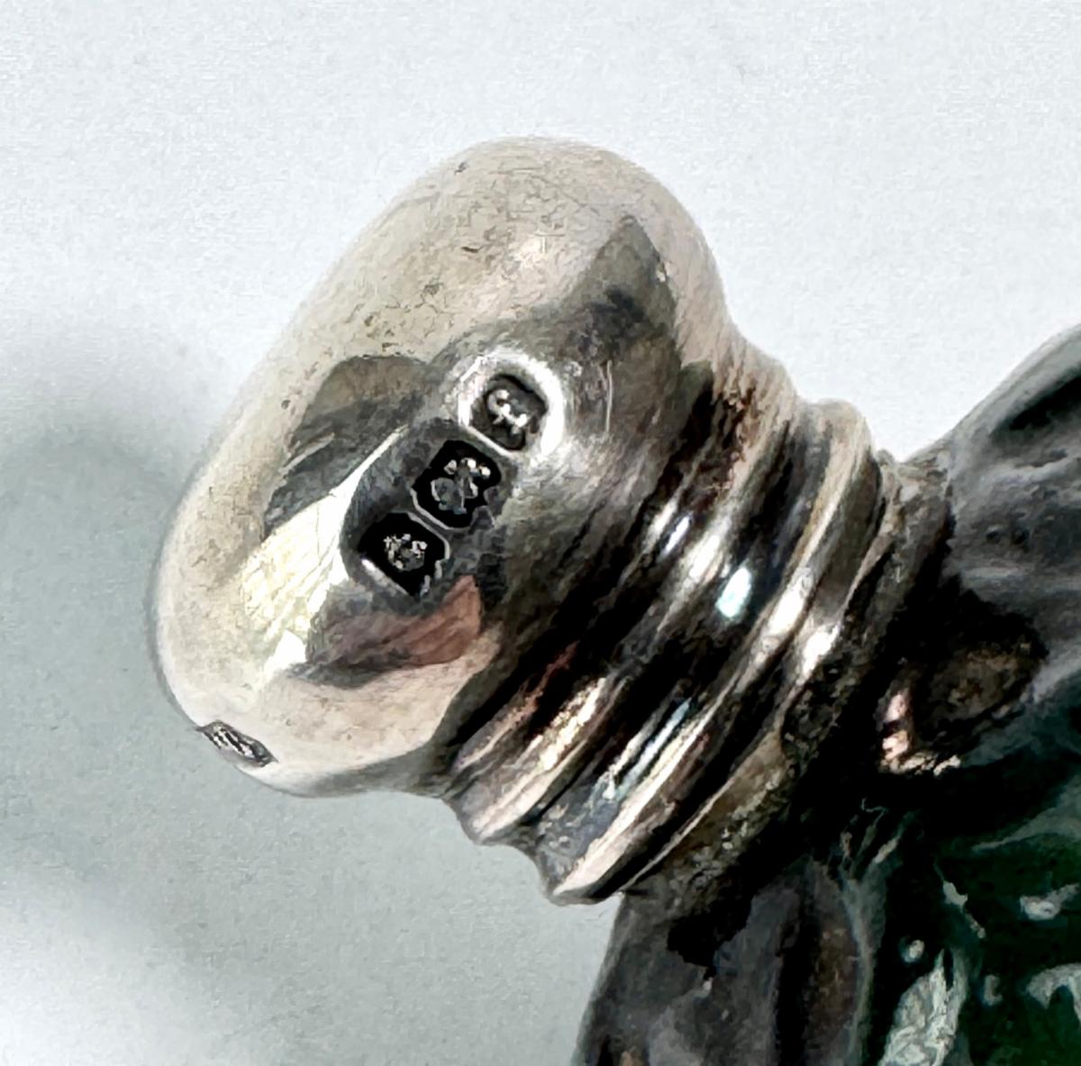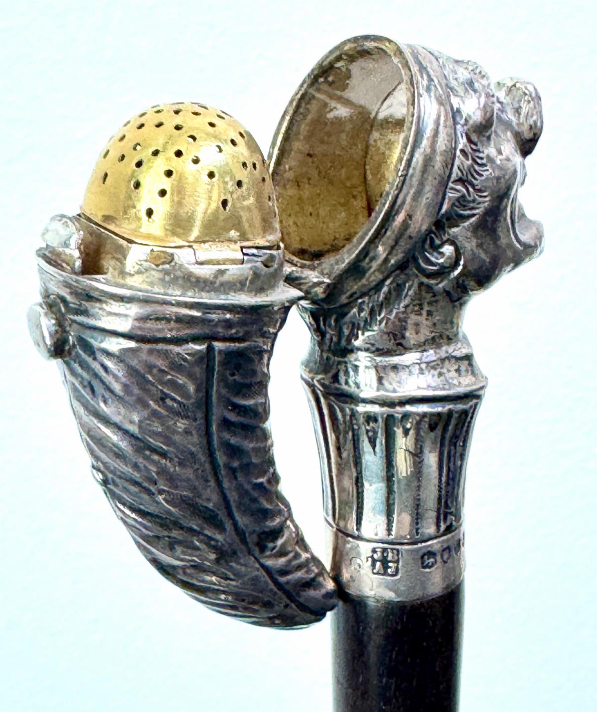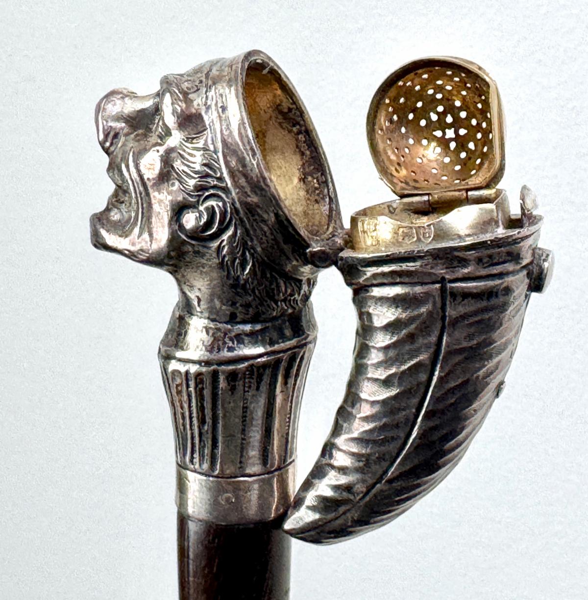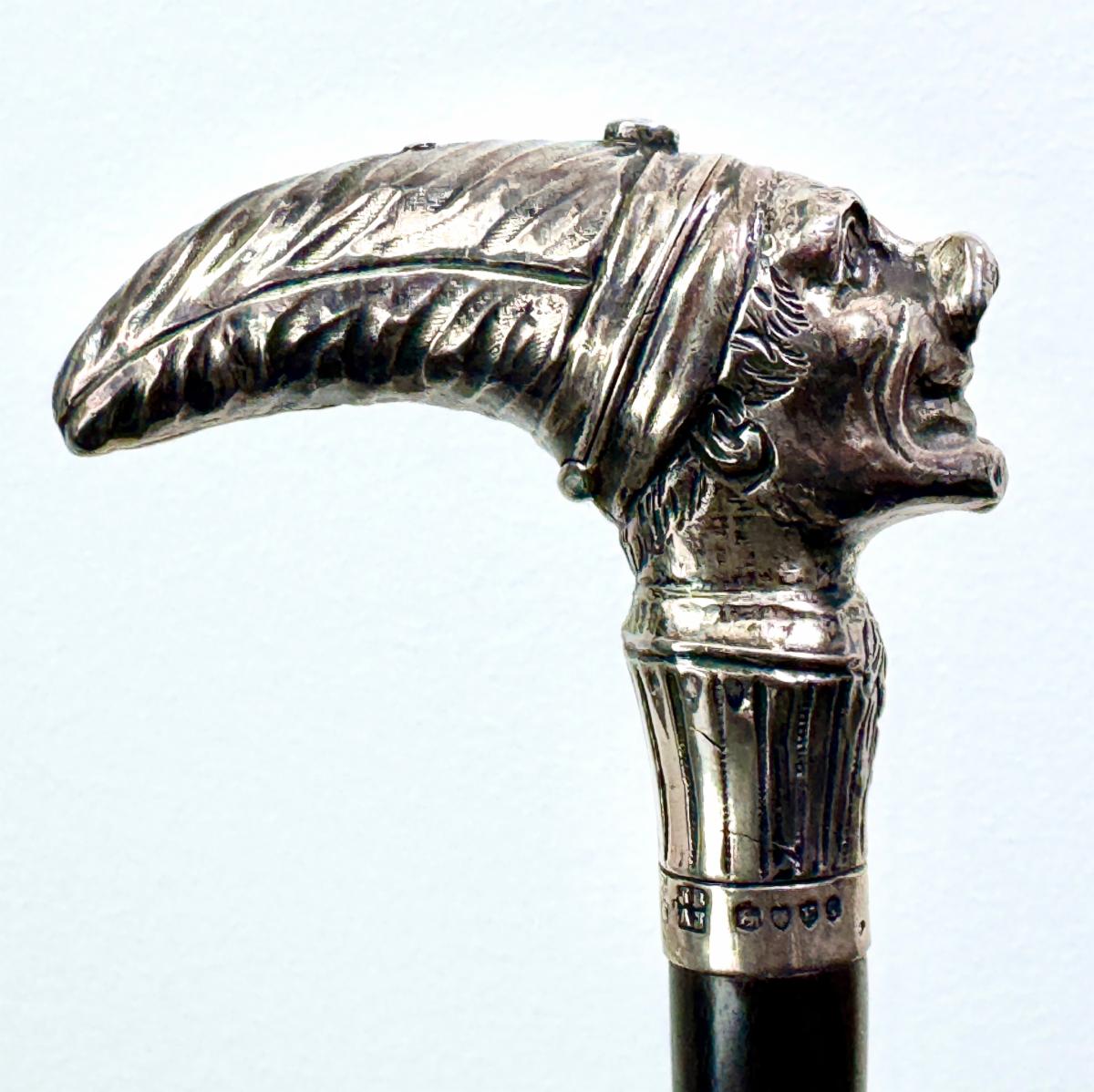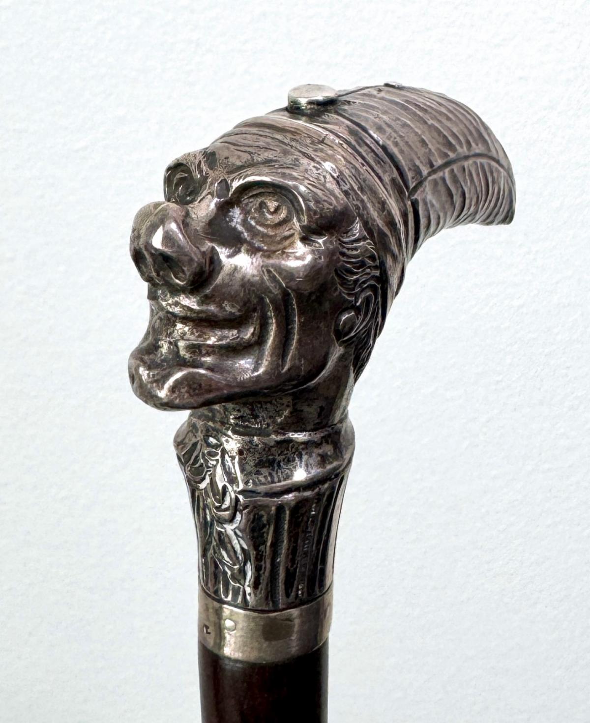 This fantastic wooden walking stick has a 3" x 2-1/2" hinged cap featuring a devilish-looking jester! The detailed handle opens to reveal the vinaigrette area. It includes the London hallmarks dating it to 1883. Can you imagine the gent who walked some of the unsanitary streets of London, needing a pleasant whiff of scent that was held in his vinaigrette cane? | |