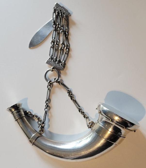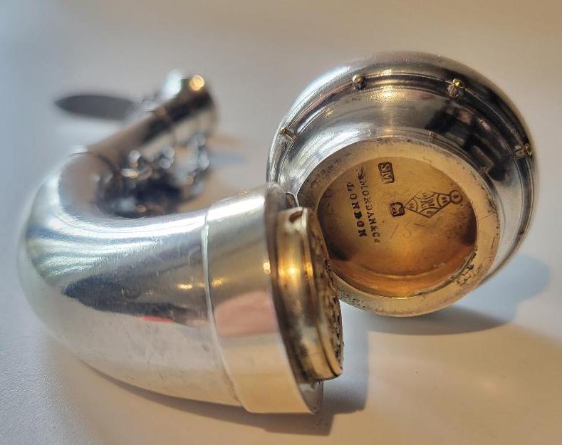 The horn-shaped vinaigrette measures 4-1/2" x 1-1/2" and opens to reveal the vinaigrette area. It includes the London hallmarks for 1853.