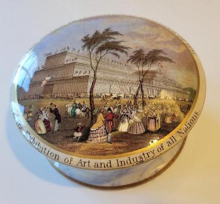 This 3" porcelain powder jar shows a beautiful scene depicting the Victorian era Exhibition. Printed around the edge is "The Grand International Building of 1851 For the Exhibition of Art and Industry of All Nations." It's part of the World's Fair display at Perfume Passage. | |