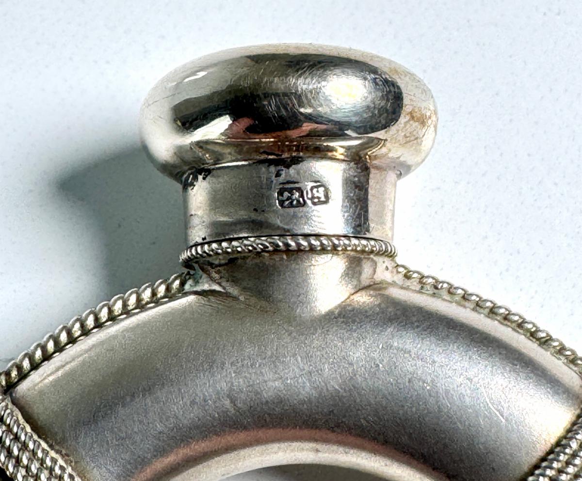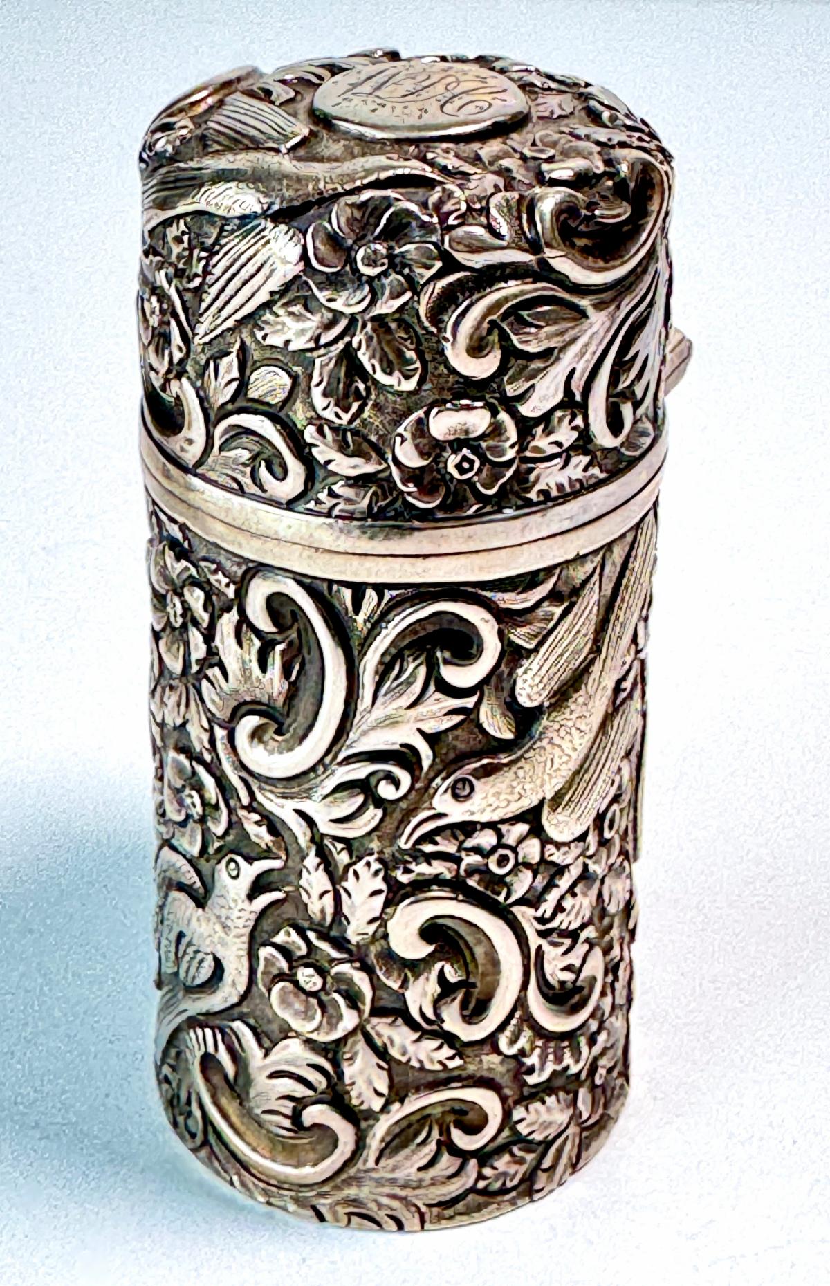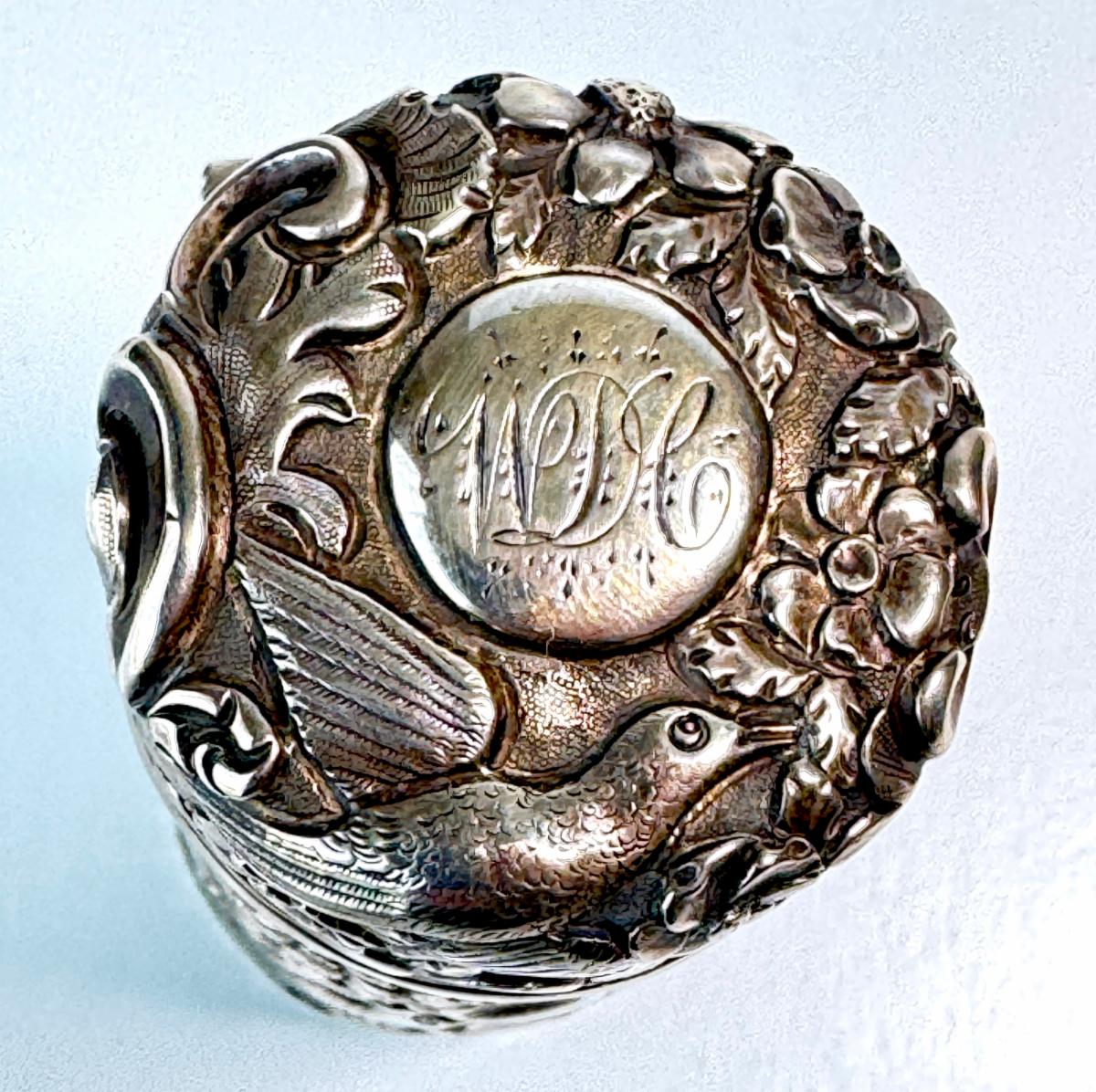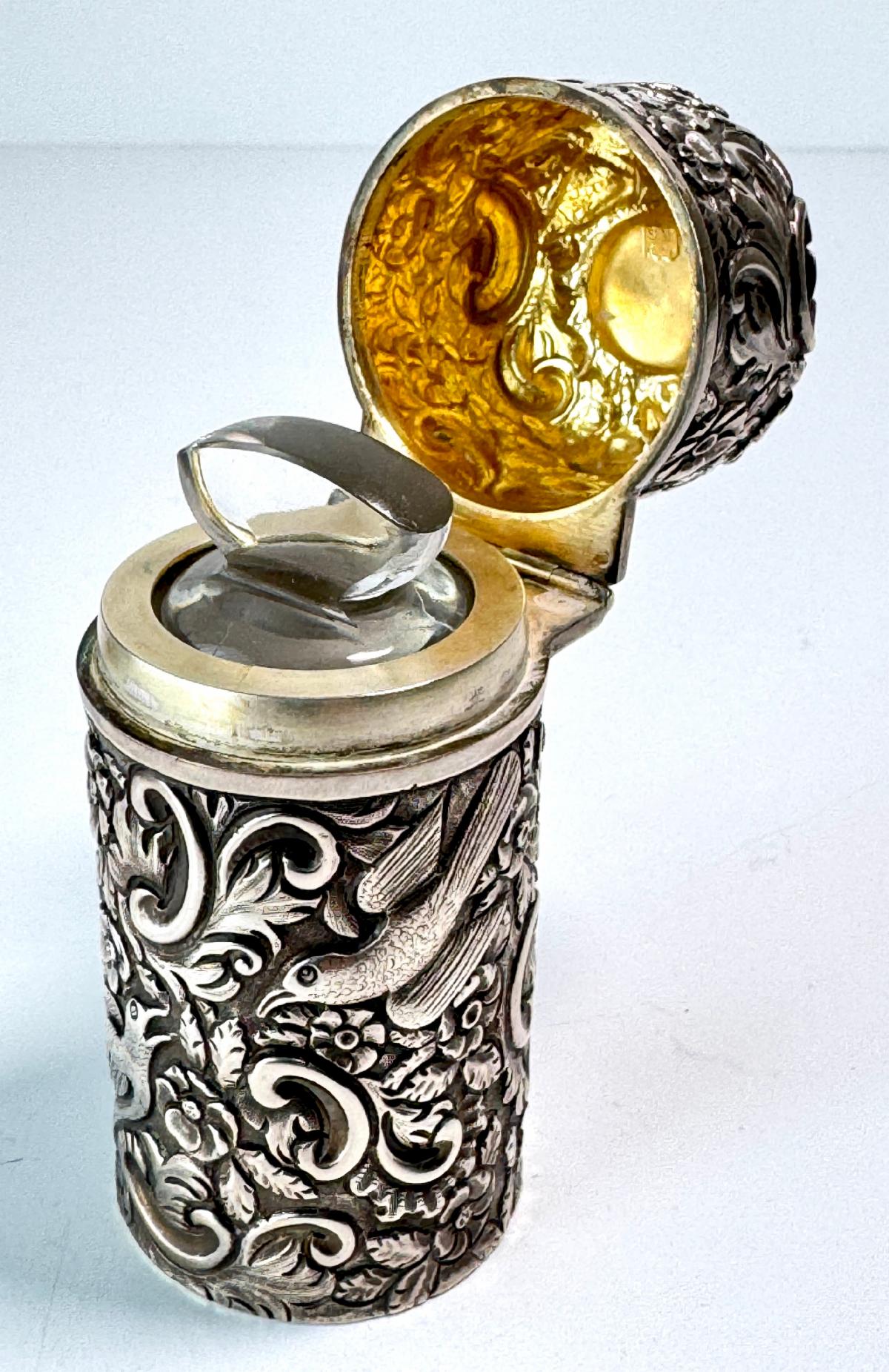 This heavy 3" x 1-1/2" sterling perfume container includes a swirly floral design, along with birds! It has a WDC monogram on the lid. The hinged container opens to reveal a glass bottle inside.