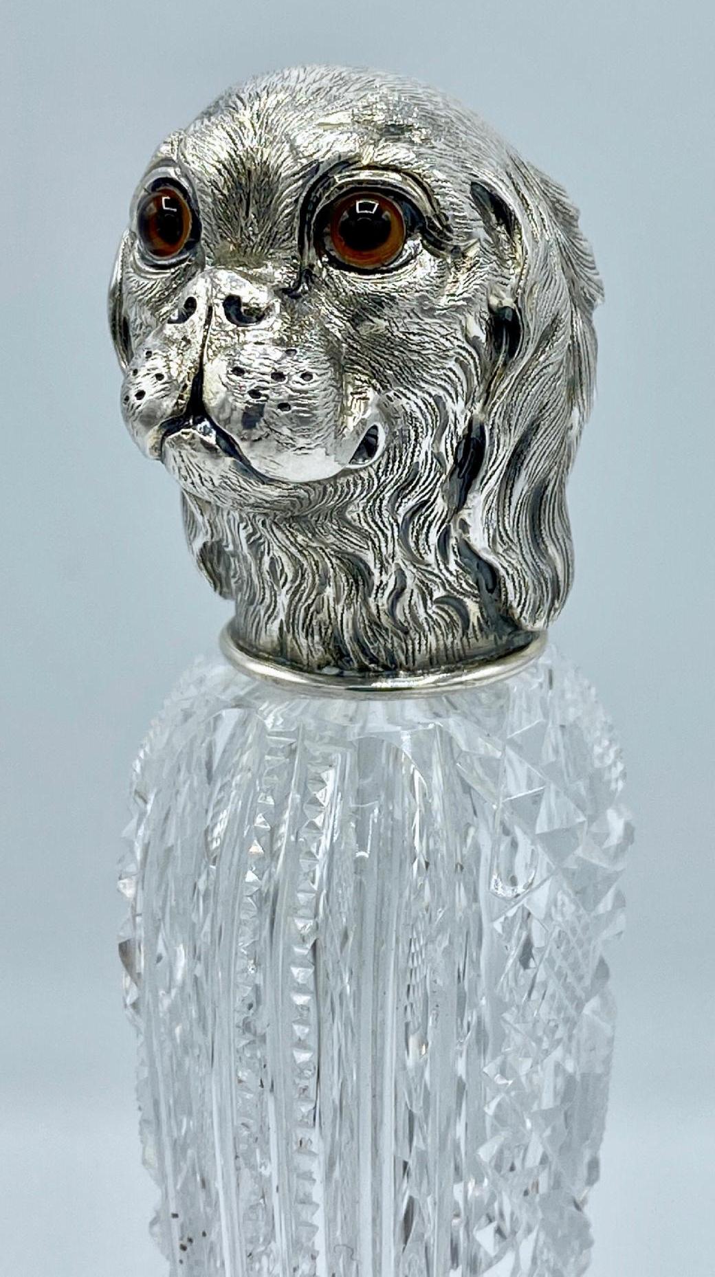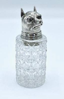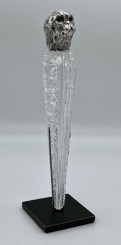 The Victorian display in the Vault gallery includes this 8” cut glass perfume bottle with a screw off sterling dog head cap. He has red glass eyes and includes the English hallmarks dating it to 1896. | |