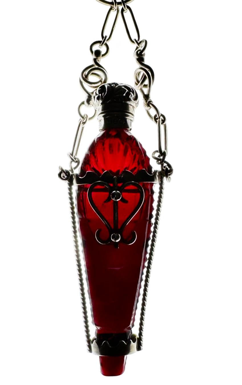 This 3-3/4" deep red ribbed glass perfume includes chains and a finger ring. It has a swirl design on the front with a hinged cap and glass stopper.