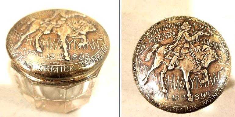 A Victorian lady's vanity table would have included a variety of dresser jars and trinkets. This beautiful 2" round, 1-1/2" tall Gorham glass dresser jar has an ornate sterling lid that features a man on a horse. It's engraved "Souvenir 175th DeKoven and Smith's Performance The Highwayman, April 13, 1898 Broadway Theatre Opera Company." The lid also has the name Andrew A. McCormick, Manager.