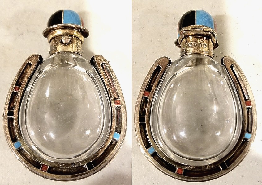 This 3-1/4" x 2-1/4" Victorian glass horseshoe-shaped perfume bottle has blue, red and black enamel, sterling mounts and a hinged jockey cap lid. It includes the hallmarks with the lion indicating the bottle is sterling, the London assay office symbol and the letter 'q' that dates the bottle to 1871. | |