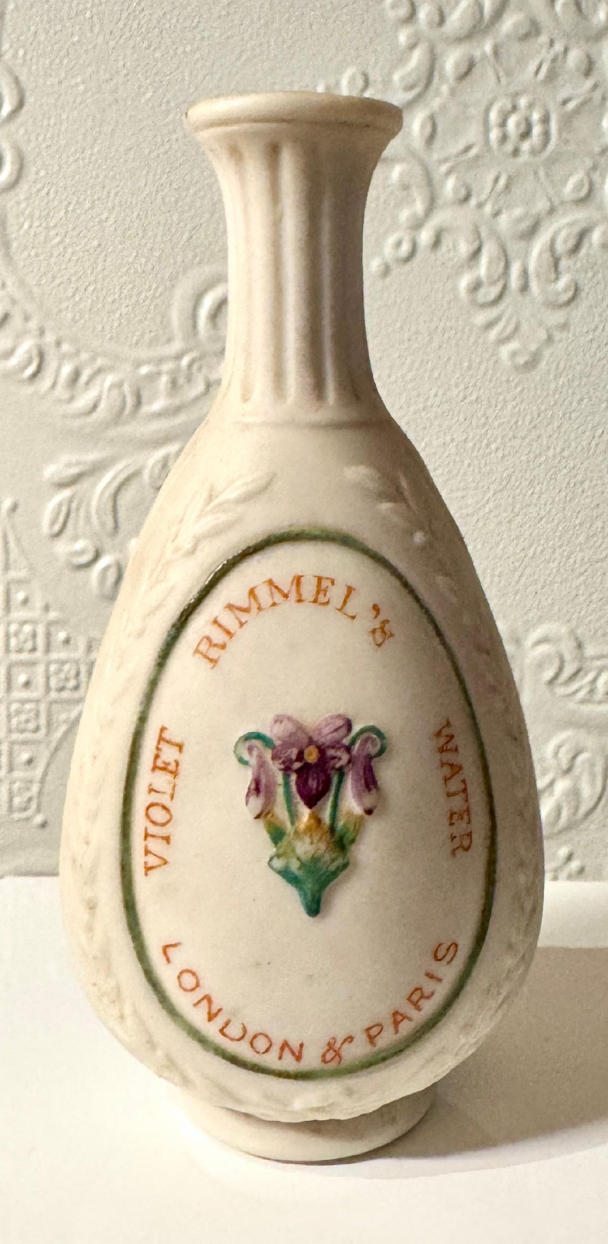 The Rimmel Violet Toilet Water perfume bottle is made of porcelain and dates from around 1866. It has an embossed wreath design on the side, flowers on the front and a baby on the back. It measures 4-3/4" tall and is on display in the drugstore at Perfume Passage. | |