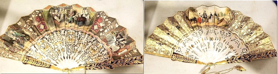 A Victorian fan in the Perfume Passage collection includes this 10-1/2" gold-tone fan below. It has a dangling urn-shaped perfume with a green stone on both sides. The paper fan opens to reveal ornate mother-of-pearl sticks with colorful detailed scenes of people on both sides. Amazing that it survived!