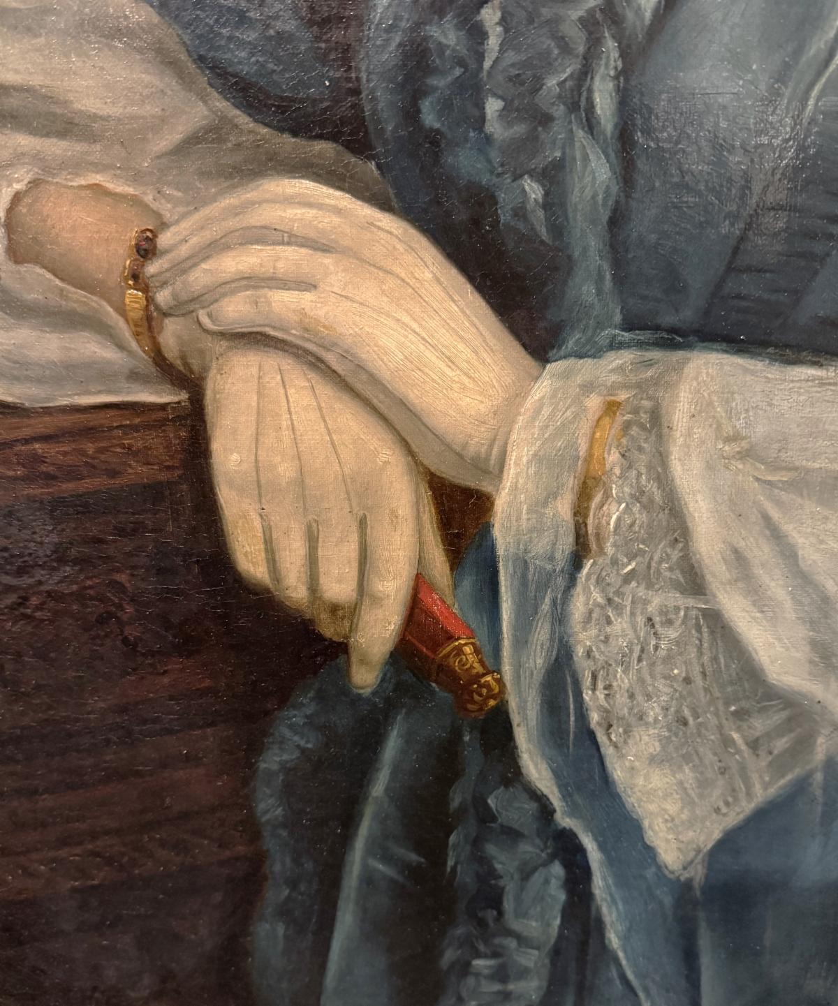 It features an elegant lady in a blue dress holding a perfume vinaigrette! The artist, William Powell Frith (1819-1909), was an English painter renowned for his vivid representations of daily life in the Victorian era. One of his early pieces, Ramsgate Sands (1854) depicting Victorian life, was purchased by Queen Victoria herself. His artwork appears in museums around the world. | |