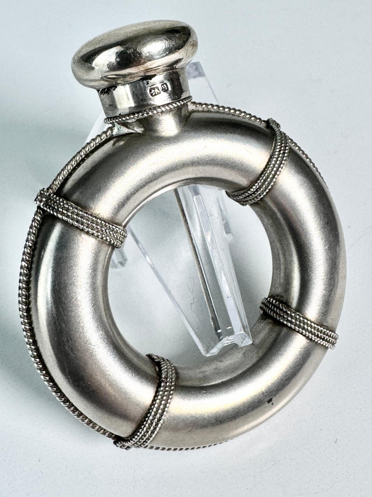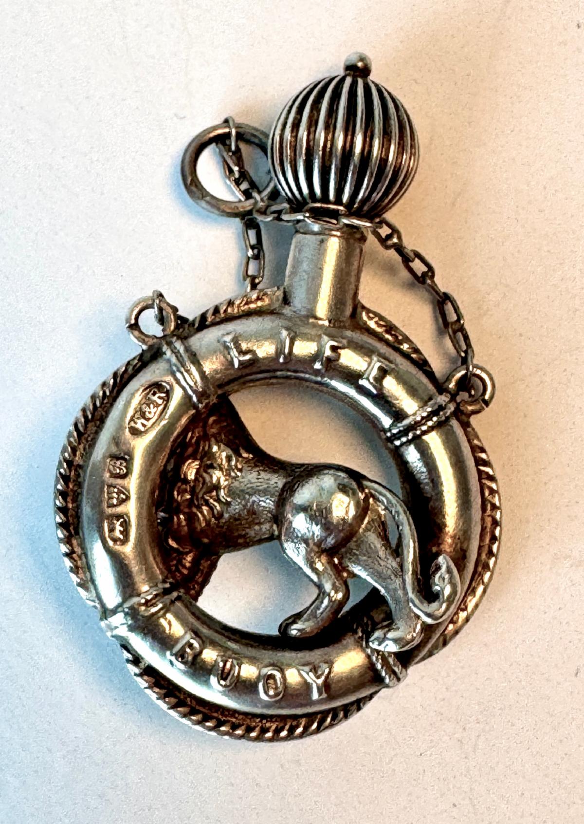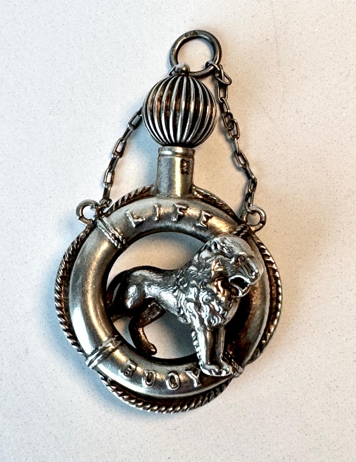 The 1-1/2" perfume (above) includes a chain to hang from a chatelaine and a screw-off cap. It says Life Buoy on both sides with a detailed lion in the center. It has the hallmarks for the Chester assay office, lion (sterling), maker initials for the White & Reynolds company and letter dating it to 1902. | |