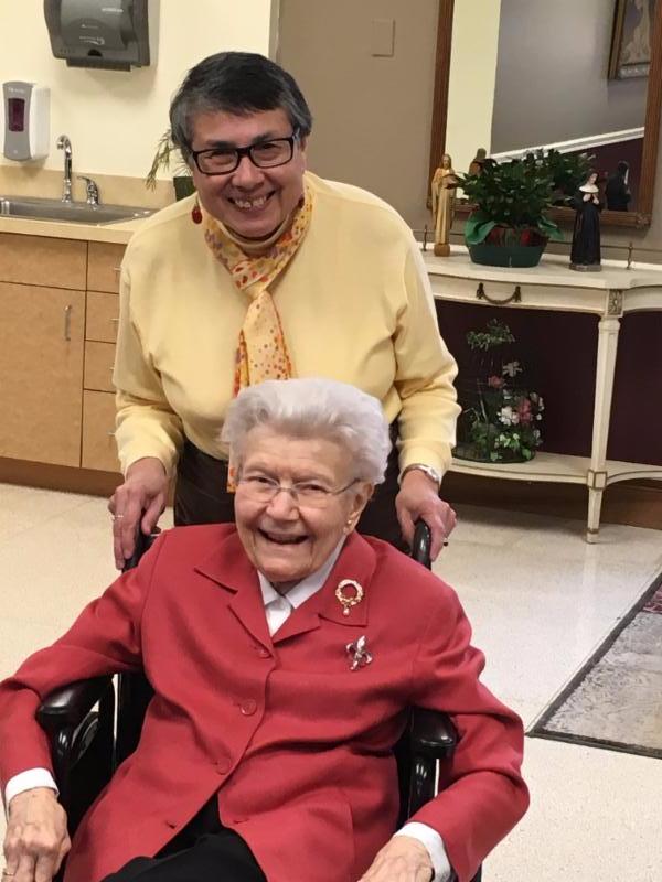 Village member and former SLU student Zuleyma Tang-Martinez (standing) and Mary Bruemmer at Mary's birthday celebration. Photo: Linda Pinsker.