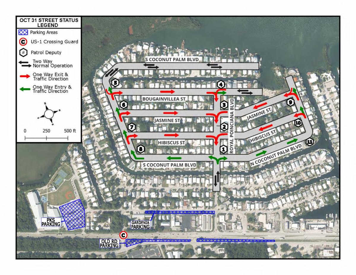 This announcement serves to inform you about upcoming changes to traffic flow in the Plantation Key Colony neighborhood on October 31, 2025, Halloween night.
