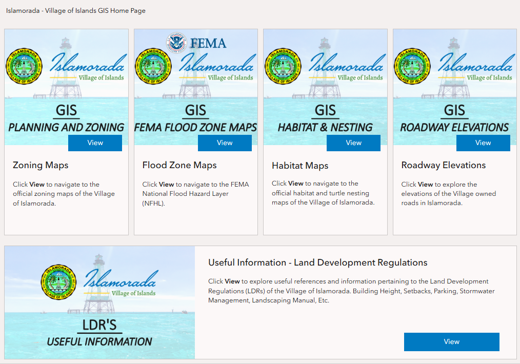 Islamorada, Village of Islands, is pleased to introduce a new GIS web experience designed for public use. The GIS home page provides interactive access to a variety of maps and planning resources to help residents, businesses, and visitors better understand the Village.