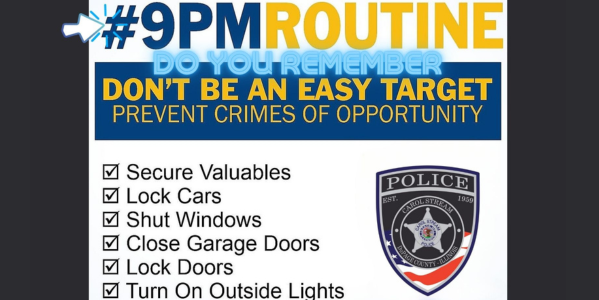 October is National Crime Prevention Month, and the Carol Stream Police Department encourages residents to take simple nightly steps to help prevent theft and keep our neighborhoods safe. Just a few minutes each evening can make a big difference. Find more safety tips and resources from the National Crime Prevention Council.