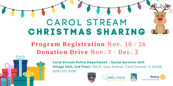 Donate new, unwrapped toys or personal care items at Village Hall, Park District, Library, or Fire Department. Monetary donations (checks payable to “Carol Stream Christmas Sharing”) are also welcome.