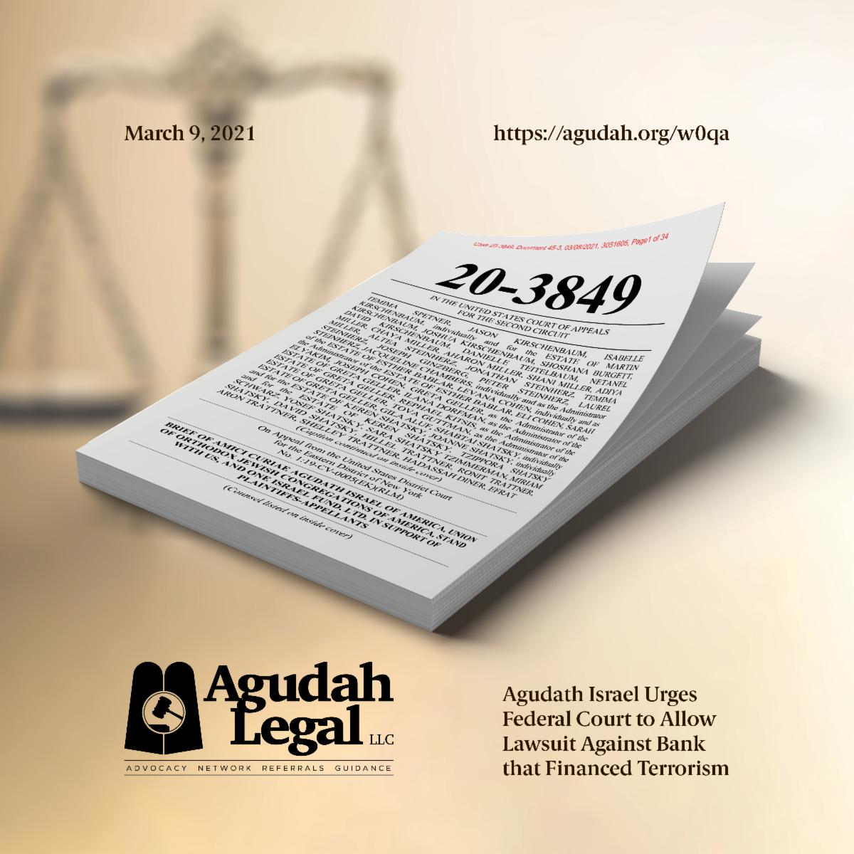 Agudath Israel of America submitted an amicus curiae “friend of the court” brief in the United States Court of Appeals for the Second Circuit in the case of Spetner v. Palestine Investment Bank. The case – which is brought by American citizens whose family members were injured or killed in terrorist attacks during the Second Intifada – asks that the court allow a lawsuit to proceed against a bank that was used by terrorist organizations to encourage attacks against Jews by providing financial assistance to families of suicide bombers and other terrorists.
