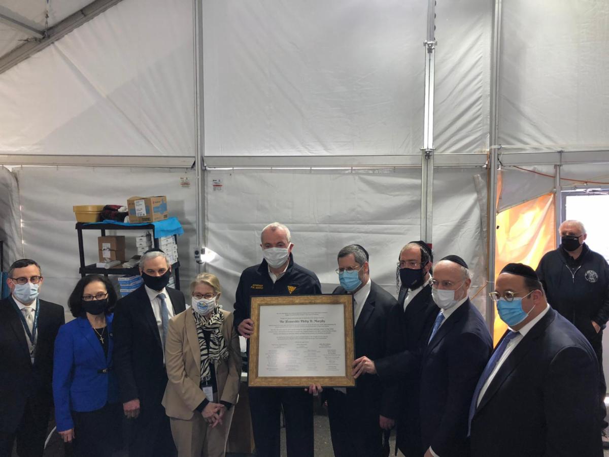 New Jersey Governor Phil Murphy visited Lakewood this morning to observe the vaccine distribution at CHEMED. While there, community leaders, including Agudath Israel's Rabbi Avi Schnall, took the opportunity to thank the Governor for his devoted leadership and religious sensitivity during the pandemic and presented him with a plaque (and a box of Matzos).
