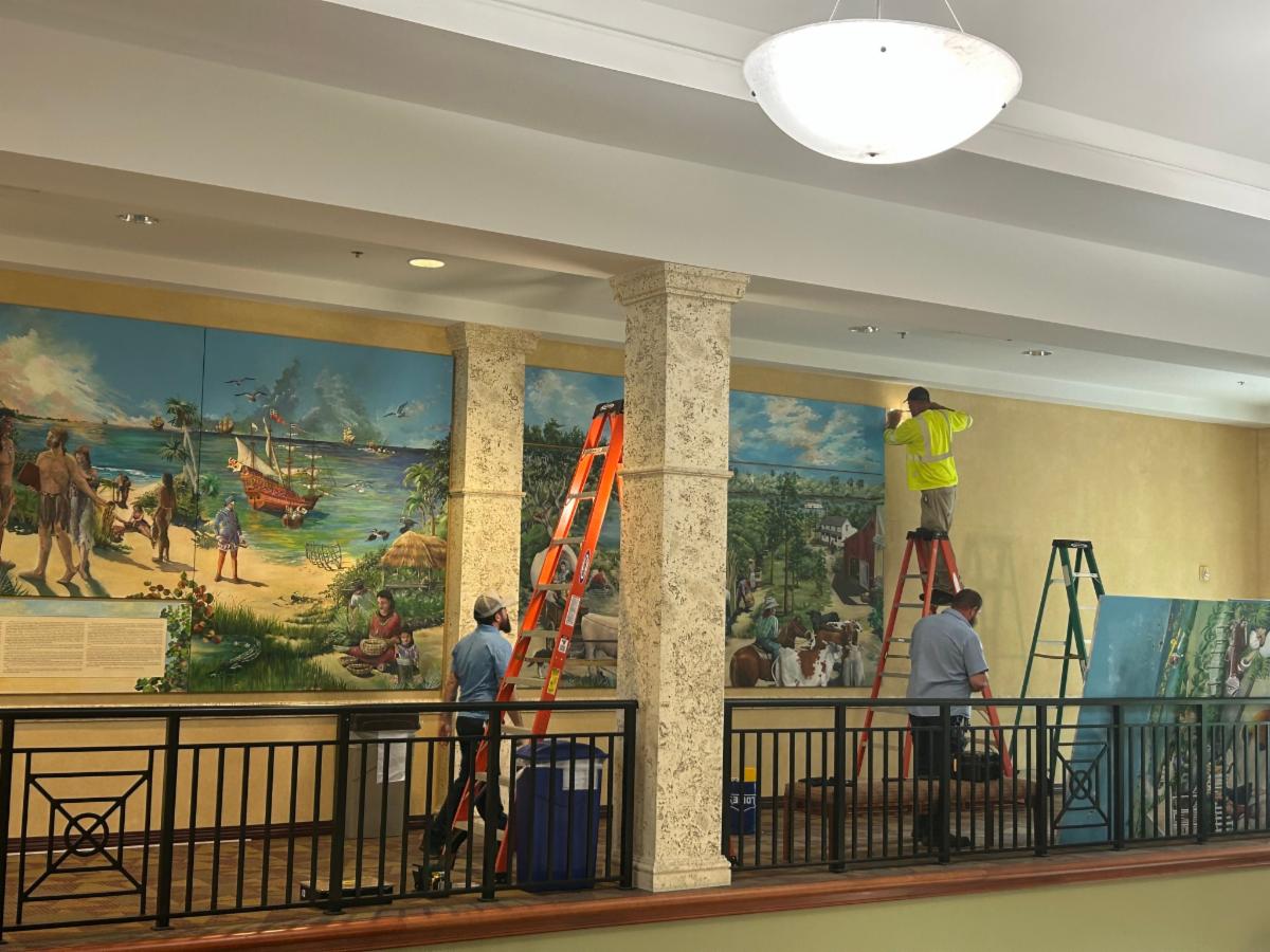 Exciting news in the arts. Two 30-foot murals originally housed in the Vero Beach Community Center—The History of the Treasure Coast (1998) and The Habitats of Vero Beach (2012)—have been relocated to the second-floor foyer of Indian River County Administration Building A, where they will now be part of the Art in Public Places program administered by the Cultural Council of Indian River County.