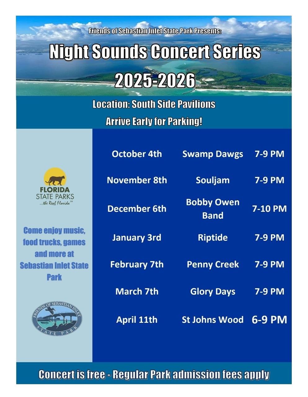 - Inclusion in Advertising: Logo will appear on; Chamber Website Banner slide ad for 6 months (Dec-May), Community Events Calendar (all 8 dates), 12 Promotional E-blasts (Dec-May), SRA Chamber Newsletter and Visit SRA Newsletter for 6 months (Dec-May), Concert posters/flyers distributed around town, displayed at 2 Kiosks, and at Pelican Porch Visitor's Center, 12 Social Media Posts on SRA Chamber of Commerce