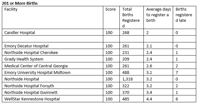 There were 32 facilities that earned perfect scores in March. The following are the top birth facilities based on timeliness and data quality score, grouped by the number of births registered during the month. To earn perfect score for the month a facility must have missing/unknown data at or below the expected levels, and at least 95% of records filed within 5 days.