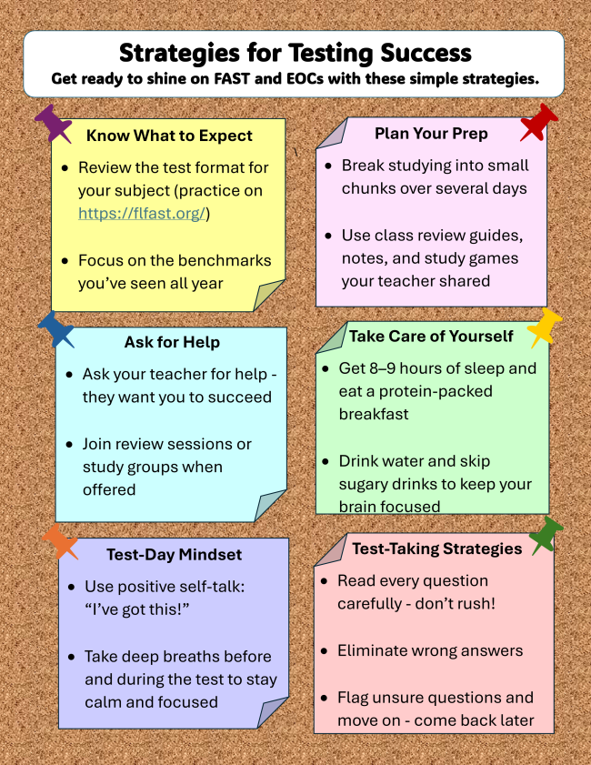 · May 1: FAST ELA Grades- 3-5, and Algebra 1 EOC Grade 12