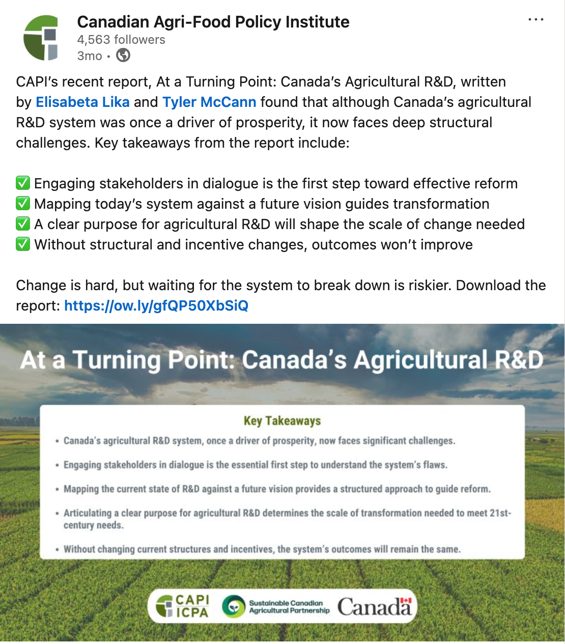 Ce numéro de la Connexion ICPA met l'accent sur la promotion du débat sur l'avenir de l'agriculture canadienne. Pour ce faire, nous avons sélectionné certains des domaines de dialogue les plus actifs qui façonnent l'agriculture canadienne aujourd'hui. De l'innovation et la R-D à la gestion de l'offre, en passant par les paiements de conservation, les récents webinaires et événements de l'Échange sur les politiques agricoles de l’ICPA, ces conversations reflètent l'éventail des perspectives – et le débat sain – nécessaires pour éclairer l'avenir du secteur. | | L'innovation dans l'agriculture canadienne | | Dans l'ensemble du secteur agroalimentaire, il existe un consensus croissant sur le fait que le système de R-D agricole du Canada, bien qu'il repose sur de réels atouts, ne fonctionne pas aussi efficacement qu'il le devrait pour relever les défis du XXIe siècle. Cependant, la nature des réformes potentielles et la manière de les mettre en œuvre font l'objet d'un débat. | Le rapport de l'ICPA, À la recherche de l'innovation : défis, changements et nécessité de réformes dans la R-D agroalimentaire, souligne l'importance de la confiance, du dialogue ouvert et de la volonté de dépasser les intérêts individuels pour aborder des questions complexes touchant l'ensemble du système. Le rapport analyse les résultats d'un sondage national et les discussions qui ont eu lieu lors d'ateliers approfondis, qui ont permis d'engager des conversations honnêtes sur l'adéquation du système actuel et sur l’apparence des réformes à long terme. | | Cette initiative s'inscrit dans le cadre d'un effort plus large de l'ICPA visant à favoriser un débat inclusif et fondé sur des données probantes sur l'avenir du système de R-D agricole au Canada. L'objectif n'est pas seulement d'identifier les problèmes, mais aussi de parvenir à un consensus sur les défis communs, de concevoir conjointement un cadre moderne avec les bailleurs de fonds, les exécutants et les utilisateurs, et d'élaborer des recommandations concrètes fondées sur l'expérience du monde réel. | | | |